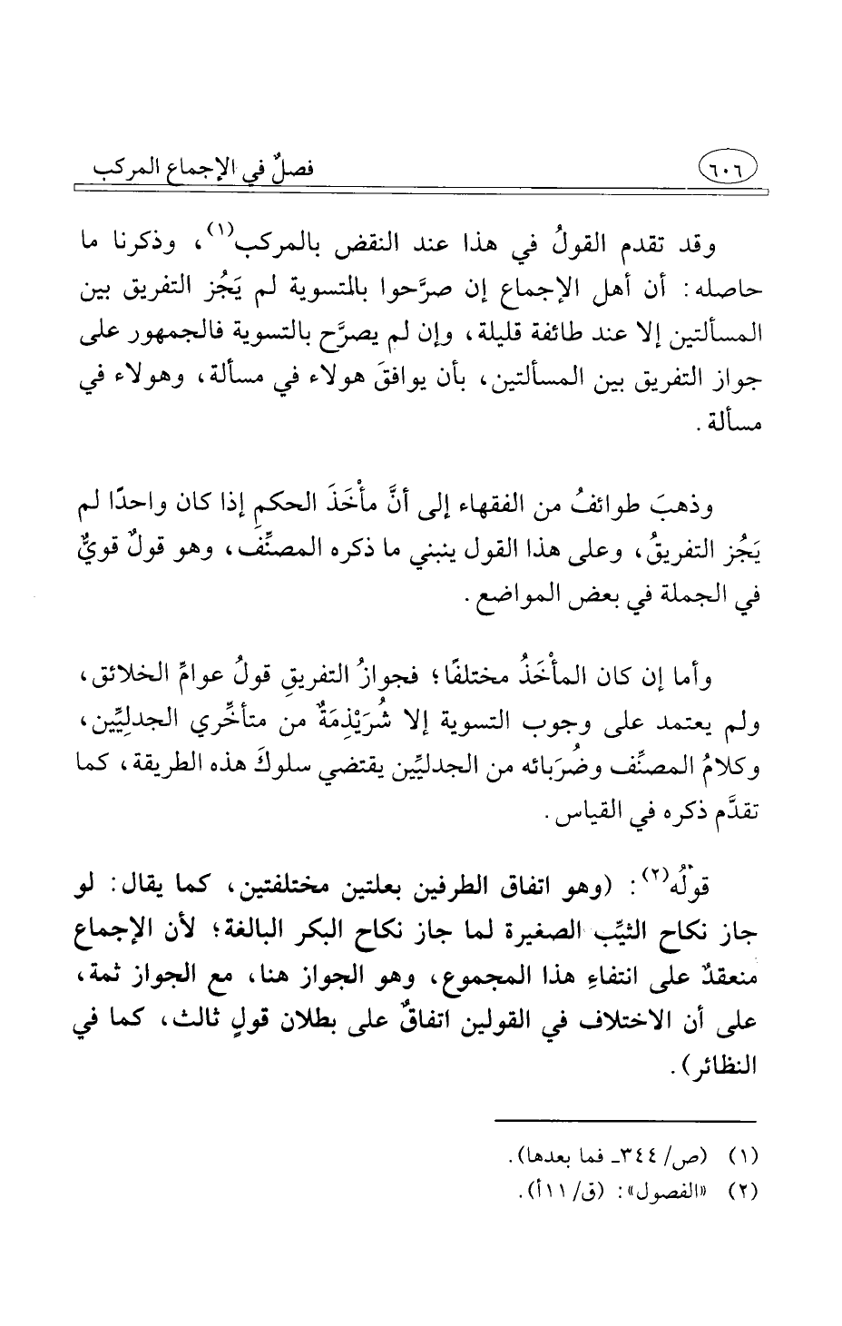 وقد تقدم القولُ في هذا عند النقض بالمركب وذكرنا ما حاصله أن أهل الإجماع إن صرَّحوا بالتسوية لم يَجُز التفريق بين المسألتين إلا عند طائفة قليلة وإن لم يصرَّح بالتسوية فالجمهور على جواز التفريق بين المسألتين بأن يوافقَ هولاء في مسألة وهولاء في مسألة