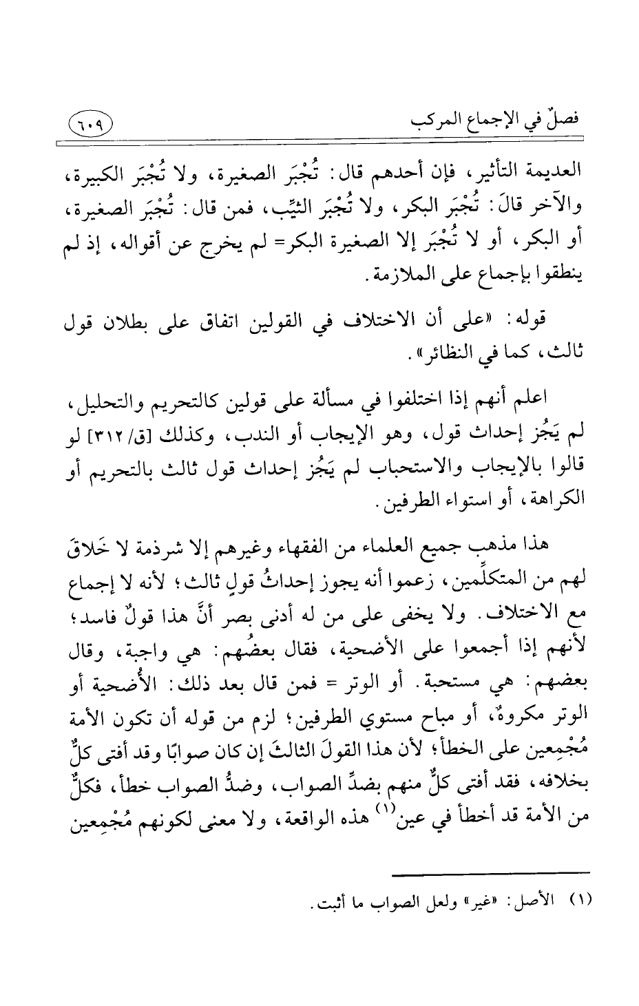 هذا مذهب جميع العلماء من الفقهاء وغيرهم إلا شرذمة لا خَلاقَ لهم من المتكلِّمين زعموا أنه يجوز إحداثُ قولٍ ثالث لأنه لا إجماع مع الاختلاف ولا يخفى على من له أدنى بصر أنَّ هذا قولٌ فاسد لأنهم إذا أجمعوا على الأضحية فقال بعضُهم هي واجبة وقال بعضهم هي مستحبة أو الوتر فمن قال بعد ذلك الأُضحية أو الوتر مكروهٌ أو مباح مستوى الطرفين لزم من قوله أن تكون الأمة مُجْمِعين على الخطأ لأن هذا القولَ الثالثَ إن كان صوابًا وقد أفتى كلٌّ بخلافه فقد أفتى كلٌّ منهم بضدِّ الصواب وضدُّ الصواب خطأ فكلٌّ من الأمة قد أخطأ في عين هذه الواقعة ولا معنى لكونهم مُجْمِعين