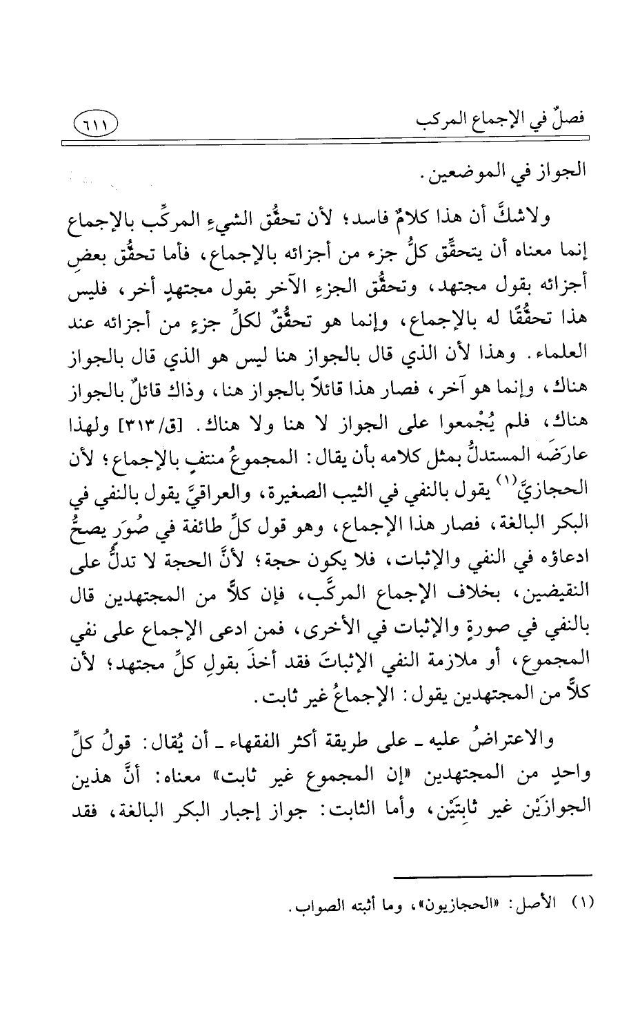 ولاشكَّ أن هذا كلامٌ فاسد لأن تحقُّق الشيءِ المركِّب بالإجماع إنما معناه أن يتحقَّق كلُّ جزء من أجزائه بالإجماع فأما تحقُّق بعضِ أجزائه بقول مجتهد وتحقُّق الجزءِ الآخر بقول مجتهدٍ أخر فليس هذا تحقُّقًا له بالإجماع وإنما هو تحقُّقٌ لكلِّ جزءٍ من أجزائه عند العلماء وهذا لأن الذي قال بالجواز هنا ليس هو الذي قال بالجواز هناك وإنما هو آخر فصار هذا قائلاً بالجواز هنا وذاك قائلٌ بالجواز هناك فلم يُجْمعوا على الجواز لا هنا ولا هناك ولهذا عارَضَه المستدلُّ بمثل كلامه بأن يقال المجموعُ منتفٍ بالإجماع لأن الحجازيَّ يقول بالنفي في الثيب الصغيرة والعراقيَّ يقول بالنفي في البكر البالغة فصار هذا الإجماع وهو قول كلِّ طائفة في صُوَرٍ يصحُّ ادعاؤه في النفي و الإثبات فلا يكون حجة لأنَّ الحجة لا تدلُّ على النقيضين بخلاف الإجماع المركَّب فإن كلاًّ من المجتهدين قال بالنفي في صورةٍ والإثبات في الأخرى فمن ادعى الإجماع على نفي المجموع أو ملازمة النفي الإثباتَ فقد أخذَ بقولِ كلِّ مجتهد لأن كلاًّ من المجتهدين يقول الإجماعُ غير ثابت
