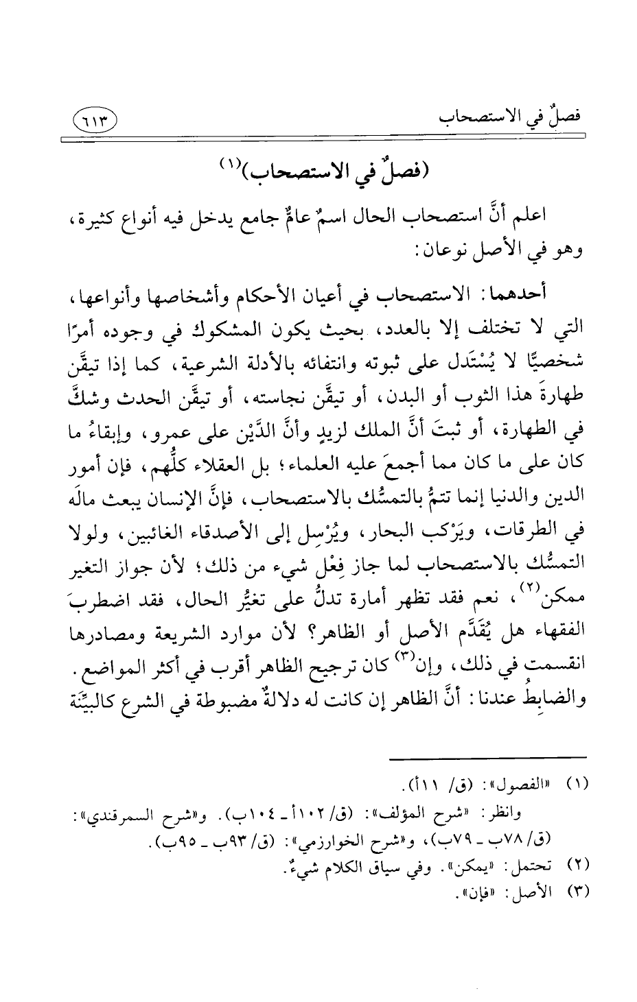 أحدهما الاستصحاب في أعيان الأحكام وأشخاصها وأنواعها التي لا تختلف إلا بالعدد بحيث يكون المشكوك في وجوده أمرًا شخصيًّا لا يُسْتَدل على ثبوته وانتفائه بالأدلة الشرعية كما إذا تيقَّن طهارةَ هذا الثوب أو البدن أو تيقَّن نجاسته أو تيقَّن الحدث وشكَّ في الطهارة أو ثبتَ أنَّ الملك لزيدٍ وأنَّ الدَّيْن على عمرو وإبقاءُ ما كان على ما كان مما أجمعَ عليه العلماء بل العقلاء كلُّهم فإن أمور الدين والدنيا إنما تتمُّ بالتمسُّك بالاستصحاب فإنَّ الإنسان يبعث مالَه في الطرقات ويَرْكب البحار ويُرْسِل إلى الأصدقاء الغائبين ولولا التمسُّك بالاستصحاب لما جاز فِعْل شيء من ذلك لأن جواز التغير ممكن نعم فقد تظهر أمارة تدلُّ على تغيُّر الحال فقد اضطربَ الفقهاء هل يُقَدَّم الأصل أو الظاهر لأن موارد الشريعة ومصادرها انقسمت في ذلك وإن كان ترجيح الظاهر أقرب في أكثر المواضع والضابِطُ عندنا أنَّ الظاهر إن كانت له دلالةٌ مضبوطة في الشرع كالبيِّنَة