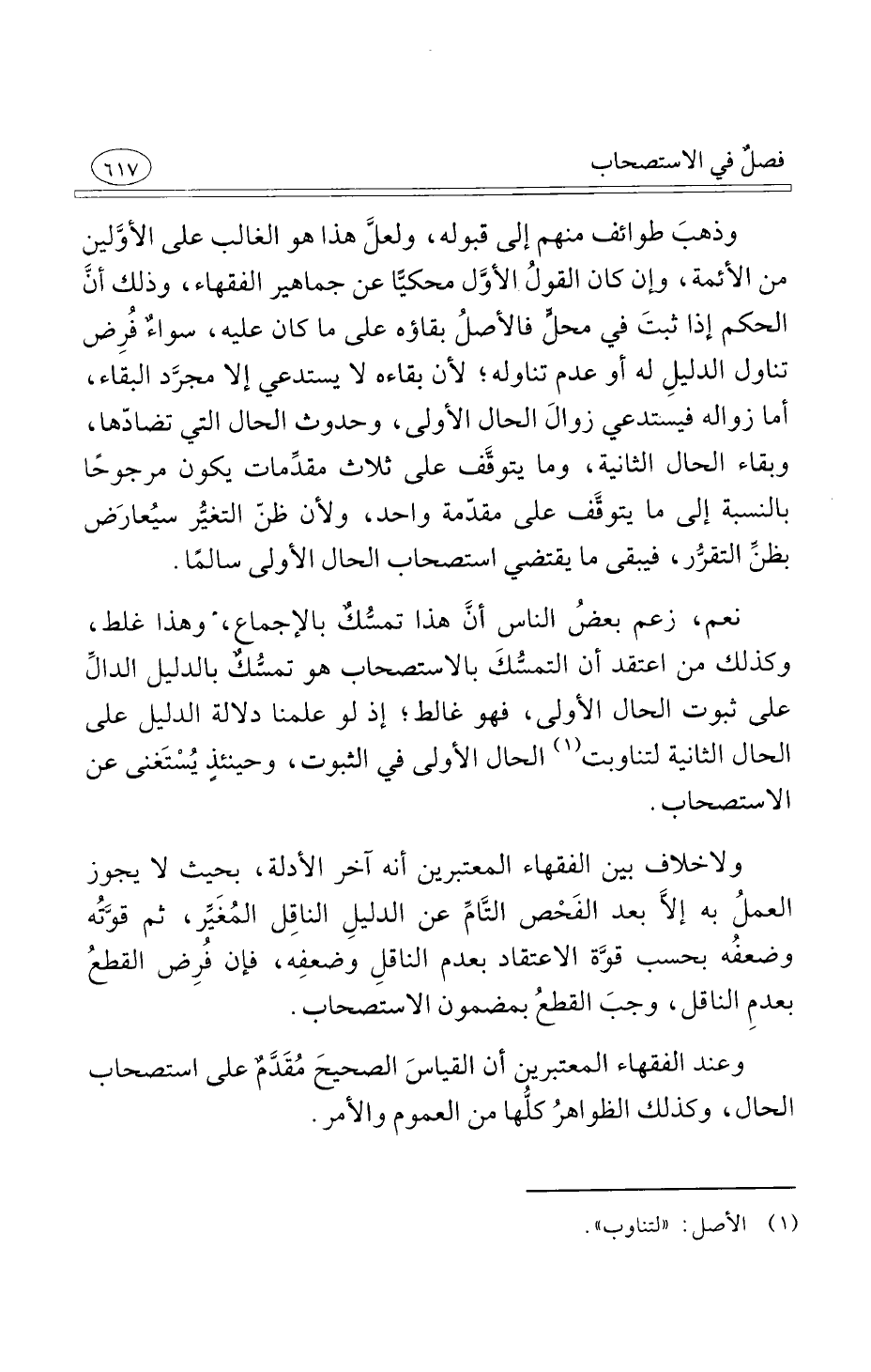 نعم زعم بعضُ الناس أنَّ هذا تمسُّكٌ بالإجماع وهذا غلط وكذلك من اعتقد أن التمسُّكَ بالاستصحاب هو تمسُّكٌ بالدليل الدالِّ على ثبوت الحال الأولى فهو غالط إذ لو علمنا دلالة الدليل على الحال الثانية لتناوبت الحال الأولى في الثبوت وحينئذٍ يُسْتَغنى عن الاستصحاب