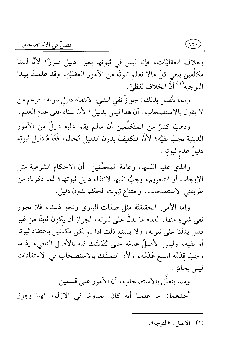 وأما الأمور الحقيقيّّة مثل صفات الباري ونحو ذلك فلا يجوز نفي شيءٍ منها لعدم ما يدلُّ على ثبوته لجواز أن يكون ثابتًا من غير دليل يدلنا على ثبوته ولا يمتنع ذلك إذا لم نكن مكلَّفين باعتقاد ثبوته أو نفيه وليس الأصلُ عدمَه حتى يُتَمَسَّك فيه بالأصل النافي إذ ما وجبَ قِدَمُه امتنع عَدَمُه ولأن التمسُّك بالاستصحاب في الاعتقادات ليس بجائز