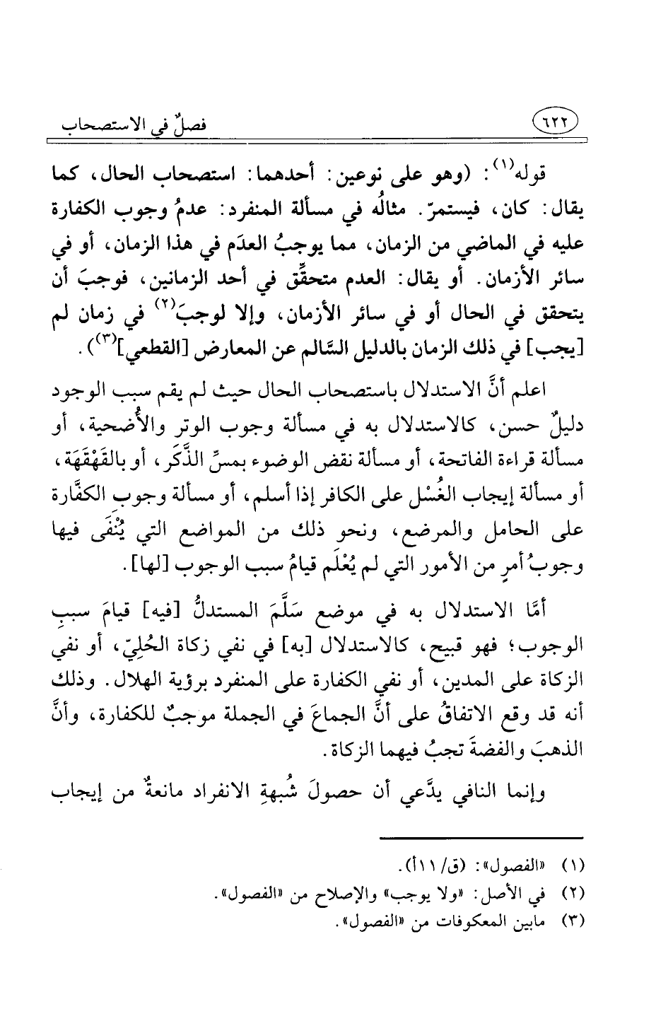 قوله وهو على نوعين أحدهما استصحاب الحال كما يقال كان فيستمرّ مثالُه في مسألة المنفرد عدمُ وجوب الكفارة عليه في الماضي من الزمان مما يوجبُ العدمَ في هذا الزمان أو في سائر الأزمان أو يقال العدم متحقِّق في أحد الزمانين فوجبَ أن يتحقق في الحال أو في سائر الأزمان وإلا لوجبَ في زمان لم يجب في ذلك الزمان بدليل السَّالم عن المعارض القطعي