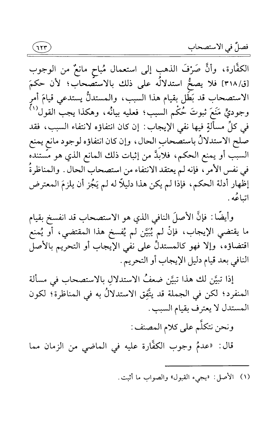 الكفَّارة وأنَّ صّرْفَ الذهب إلى استعمال مُباحٍ مانعٌ من الوجوب فلا يصحُّ استدلالُه على ذلك بالاستصحاب لأن حكمَ الاستصحاب قد بَطَل بقيام هذا السبب والمستدلُّ يستدعي قيامَ أمرٍ وجوديٍّ مَنَعَ ثبوتَ حُكْم السبب فعليه بيانُه وهكذا يجب القول في كلِّ مسألةٍ فيها نفي الإيجاب إن كان انتفاؤه لانتفاء السبب فقد صلح الاستدلالُ باستصحاب الحال وإن كان انتفاؤه لوجود مانعٍ يمنع السبب أو يمنع الحكم فلابدَّ من إثبات ذلك المانع الذي هو مستنده في نفس الأمر فإنه لم يعتقد الانتفاء من استصحاب الحال والمناظرةُ إظهار أدلة الحكم فإذا لم يكن هذا دليلاً له لم يَجُز أن يلزمَ المعترض اتباعُه
