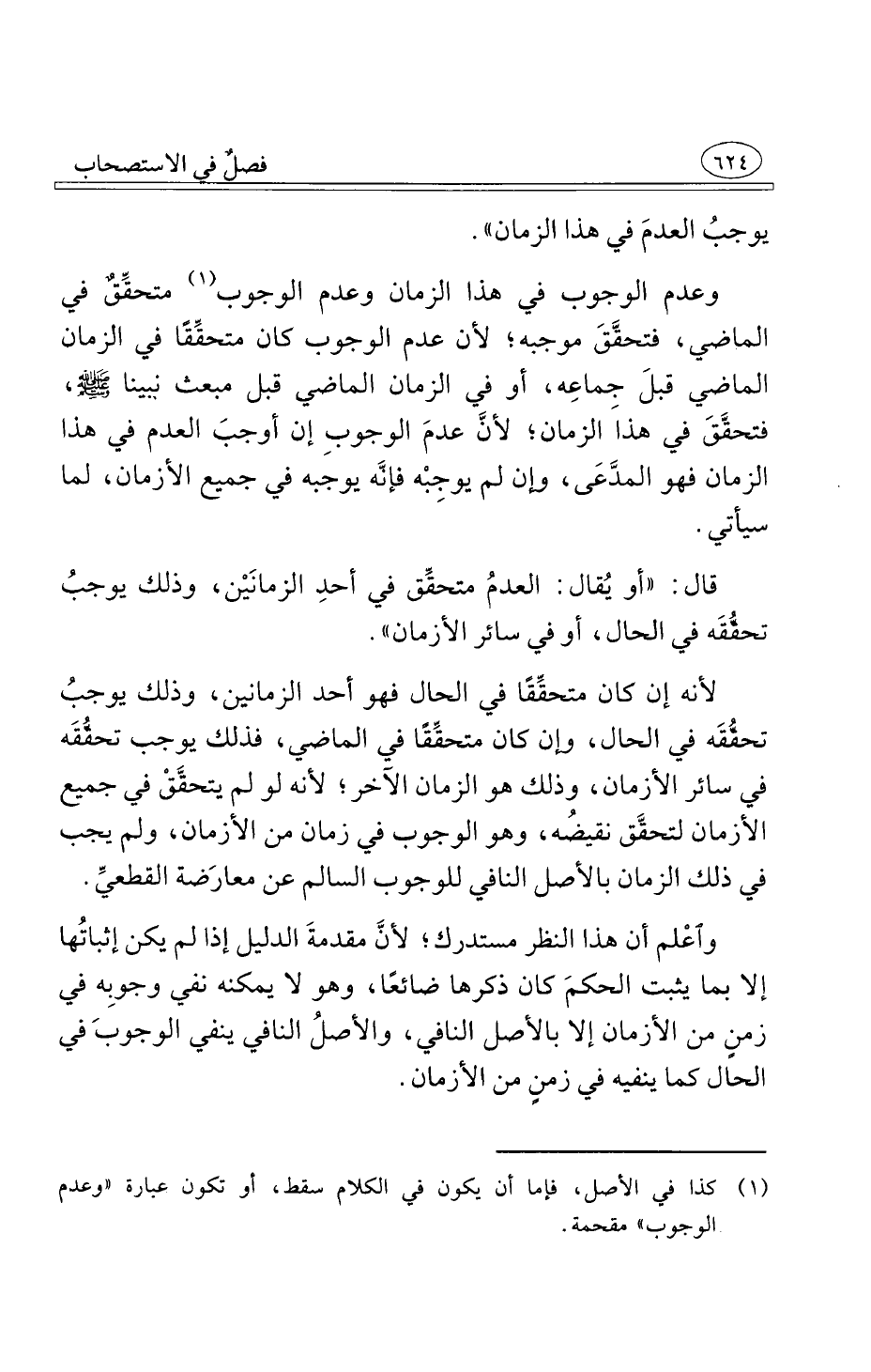 وعدم الوجوب في هذا الزمان وعدم الوجوب متحقِّقٌ في الماضي فتحقَّقَ موجبه لأن عدم الوجوب كان متحقِّقًا في الزمان الماضي قبلَ جِماعِه أو في الزمان الماضي قبل مبعث نبينا صلى الله عليه وسلم فتحقَّقَ في هذا الزمان لأنَّ عدمَ الوجوبِ إن أوجبَ العدم في هذا الزمان فهو المدَّعَى وإن لم يوجبه في جميع الأزمان لما سيأتي