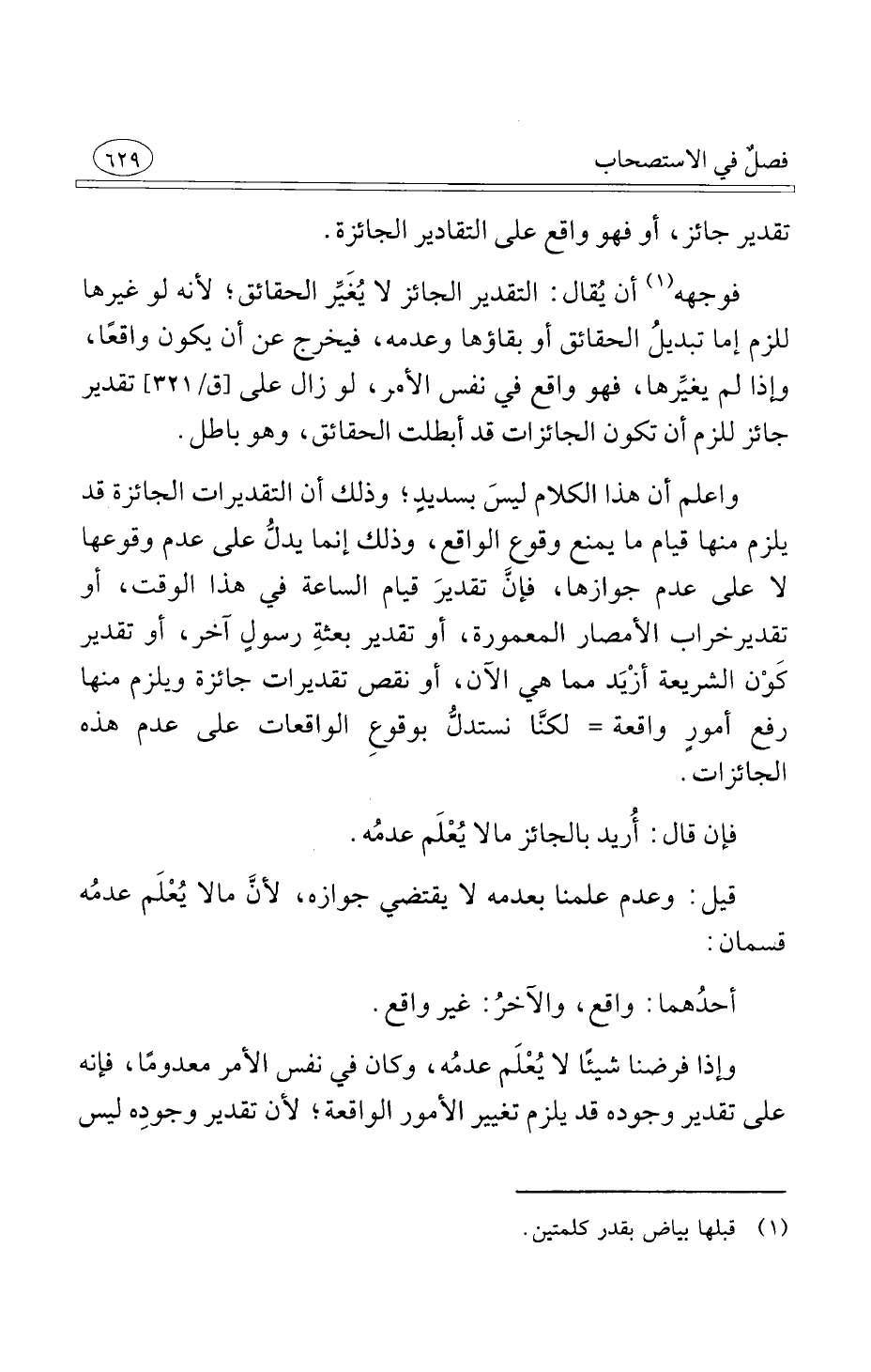 واعلم أن هذا الكلام ليسَ بسديدٍ وذلك أن التقديرات الجائزة قد يلزم منها قيام ما يمنع وقوع الواقع وذلك إنما يدلُّ على عدم وقوعها لا على عدم جوازها فإنَّ تقديرَ قيام الساعة في هذا الوقت أو تقدير خراب الأمصار المعمورة أو تقدير بعثةِ رسولٍ آخر أو تقدير كَوْن الشريعة أزْيَد مما هي الآن أو نقص تقديرات جائزة ويلزم منها رفع أمورٍ واقعة لكنَّا نستدلُّ بوقوعِ الواقعات على عدم هذه الجائزات