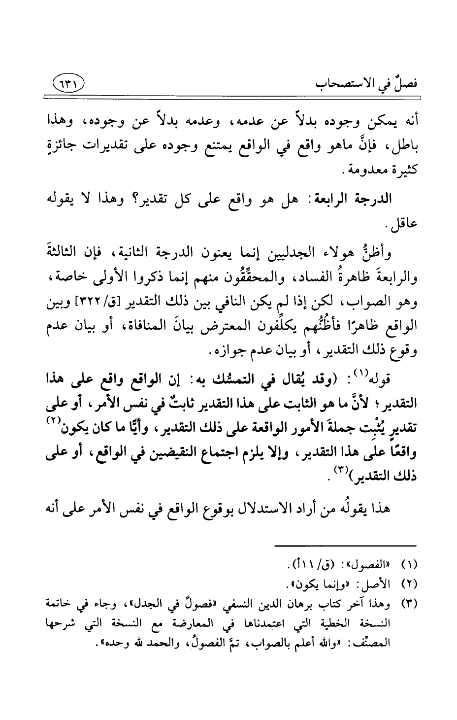 وأظنُّ هولاء الجدليين إنما يعنون الدرجة الثانية فإن الثالثةَ والرابعةَ ظاهرةُ الفساد والمحقِّقُون منهم إنما ذكروا الأولى خاصة وهو الصواب لكن إذا لم يكن النافي بين ذلك التقدير وبين الواقع ظاهرًا فأظُنُّهم يكلِّفون المعترض بيانَ المنافاة أو بيان عدم وقوع ذلك التقدير أو بيان عدم جوازه