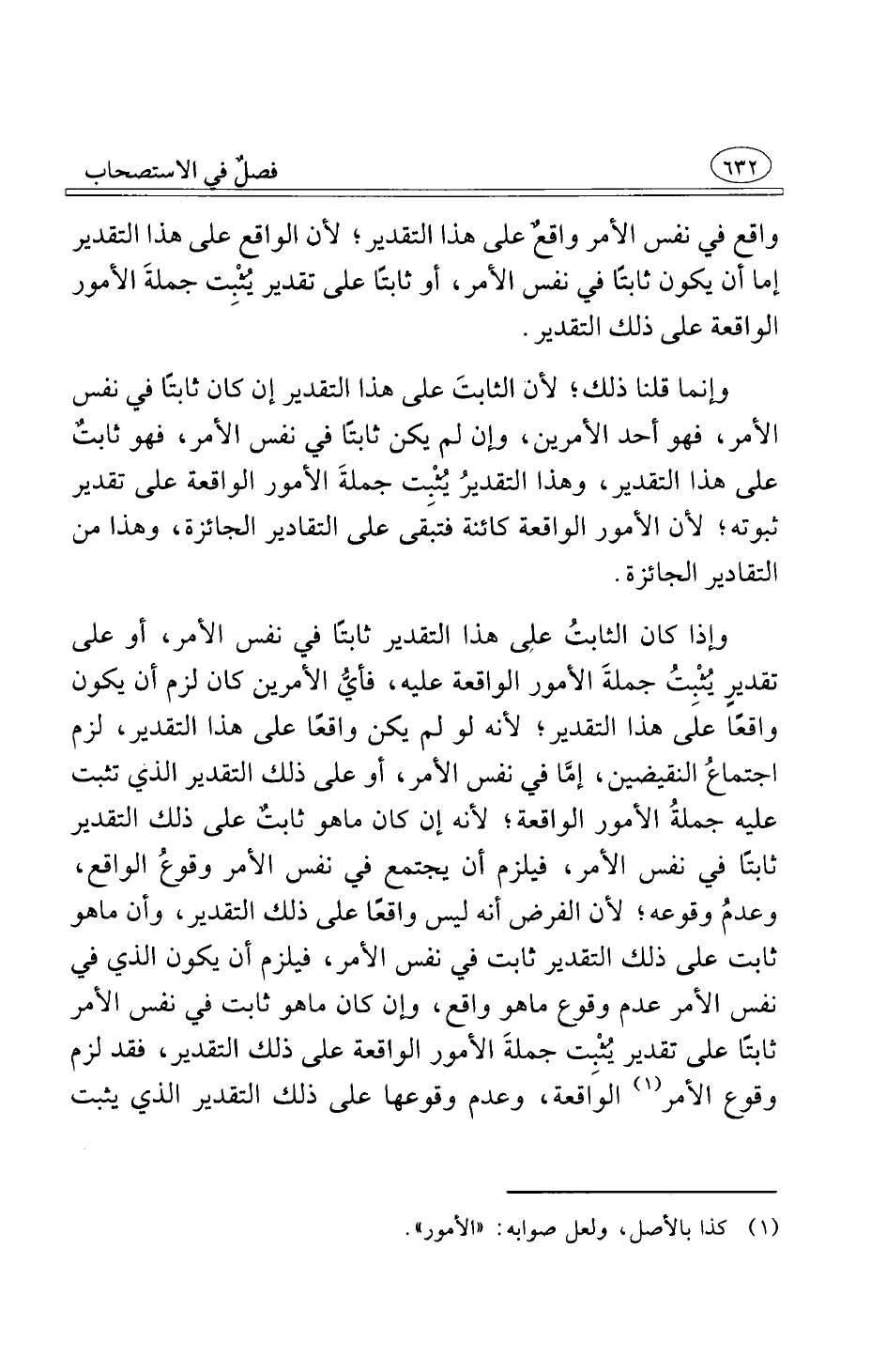 وإذا كان الثابتُ على هذا التقدير ثابتًا في نفس الأمر أو على تقديرٍ يُثْبِتُ جملةَ الأمور الواقعة عليه فأيُّ الأمرين كان لزم أن يكون واقعًا على هذا التقدير لأنه لو لم يكن واقعًا على هذا التقدير لزم اجتماعُ النقيضين إمَّا في نفس الأمر أو على ذلك التقدير الذي تثبت عليه جملةُ الأمور الواقعة لأنه إن كان ما هو ثابتٌ على ذلك التقدير ثابتًا في نفس الأمر فيلزم أن يجتمع في نفس الأمر وقوعُ الواقع وعدمُ وقوعه لأن الفرض أنه ليس واقعًا على ذلك التقدير وأن ما هو ثابت على ذلك التقدير ثابت في نفس الأمر فيلزم أن يكون الذي في نفس الأمر عدم وقوع ما هو واقع وإن كان ما هو ثابت في نفس الأمر ثابتًا على تقدير يُثْبِت جملةَ الواقعة على ذلك التقدير فقد لزم وقوع الأمر الواقعة وعدم وقوعها على ذلك التقدير الذي يثبت
