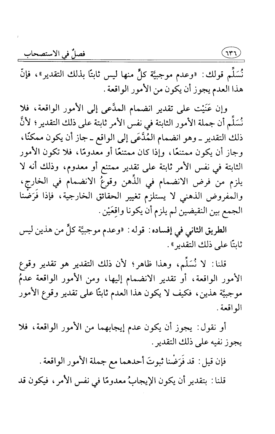 وإن عَنَيْت على تقدير انضمام المدَّعى إلى الأمور الواقعة فلا نُسَلِّم أن جملة الأمور الثابتة في نفس الأمر ثابتة على ذلك التقدير لأنَّ ذلك التقدير وهو انضمام المُدَّعَى إلى الواقع جاز أن يكون ممكنًا وجاز أن يكون ممتنعًا وإذا كان ممتنعًا أو معدومًا فلا تكون الأمور الثابتة في نفس الأمر ثابتة على تقدير ممتنع أو معدوم وذلك أنه لا يلزم من فرض الانضمام في الذِّهن وقوعُ الانضمام في الخارج والمفروض الذهني لا يستلزم تغيير الحقائق الخارجية فإذا فَرَضْنا الجمع بين النقيضين لم يلزم أن يكونا واقِعَيْن