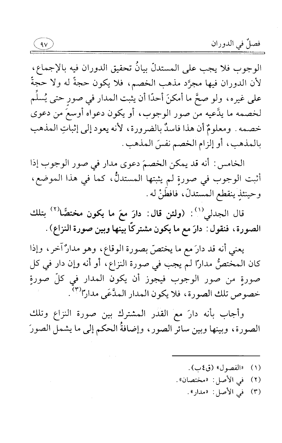 الوجوب فلا يجب على المستدلّ بيانُ تحقيق الدوران فيه بالإجماع لأن الدوران فيها مجرَّد مذهب الخصم فلا يكون حجةً له ولا حجةً على غيره ولو صحَّ ما أمكنَ أحدًا أن يثبت المدار في صورٍ حتى يُسلِّم لخصمه ما يدَّعيه من صور الوجوب أو يكون دعواه أوسعَ من دعوى خصمه ومعلومٌ أن هذا فاسدٌ بالضرورة لأنه يعود إلى إثباتِ المذهب بالمذهب أو إلزام الخصم نفسَ المذهب