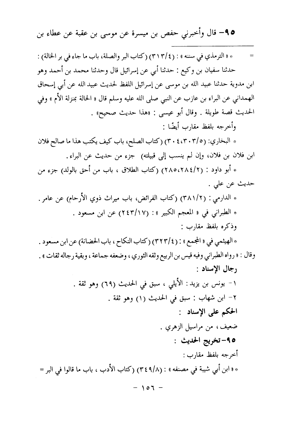 95 - وَأَخْبَرَنِي حَفْصُ بْنُ مَيْسَرَةَ، عَنْ مُوسَى بْنِ عُقْبَةَ، عَنْ عَطَاءِ بْنِ -[157]- أَبِي مَرْوَانَ، عَنْ أَبِيهِ، أَنَّ كَعْبًا، حَلَفَ لَهُ بِالَّذِي فَرَقَ الْبَحْرَ لِمُوسَى أَنَّ فِيَ التَّوْرَاةِ: «يَا ابْنَ آدَمَ» §اتَّقِ رَبَّكَ، وَبِرَّ وَالِدَيْكَ، وَصِلْ رَحِمَكَ يُمَدَّ لَكَ فِي عُمُرِكَ، وَيُيَسَّرْ لَكَ يُسْرُكَ، وَيُصْرَفْ عَنْكَ عُسْرُكَ "