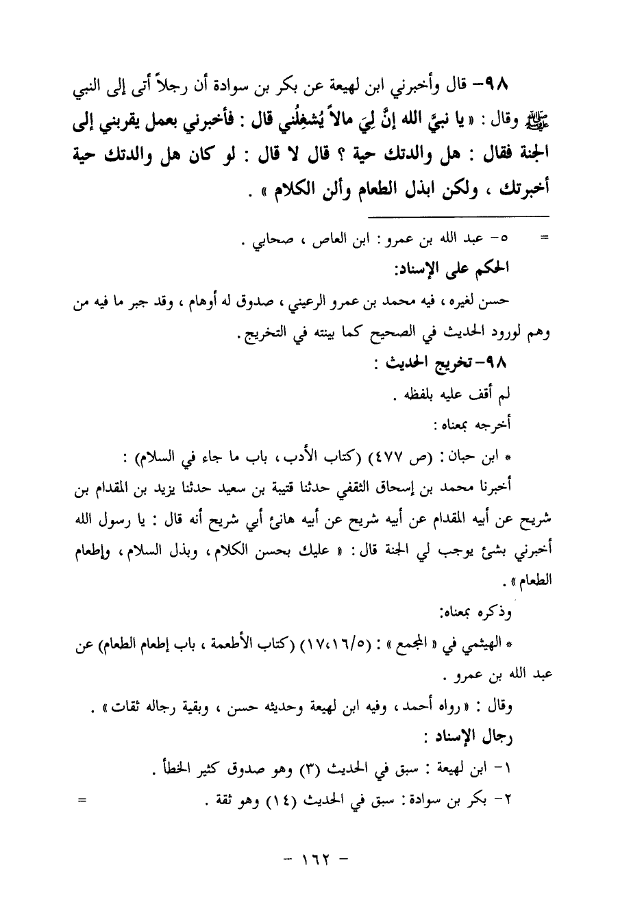 98 - وَأَخْبَرَنِي ابْنُ لَهِيعَةَ، عَنْ بَكْرِ بْنِ سَوَادَةَ، أَنَّ رَجُلًا، أَتَى إِلَى النَّبِيِّ صَلَّى اللهُ عَلَيْهِ وَسَلَّمَ وَقَالَ: " يَا نَبِيَّ اللَّهِ، إِنَّ لِي مَالًا يَشْغَلُنِي، قَالَ: فَأَخْبَرَنِي بِعَمَلٍ يُقَرِّبُنِي إِلَى الْجَنَّةِ؟، فَقَالَ: «هَلْ وَالِدَتُكَ حَيَّةٌ؟» قَالَ: لَا. قَالَ: «لَوْ كَانَتْ وَالِدَتُكَ حَيَّةً أَخْبَرْتُكَ، وَلَكِنِ §ابْذِلِ الطَّعَامَ، وَأَلِنِ الْكَلَامَ»
