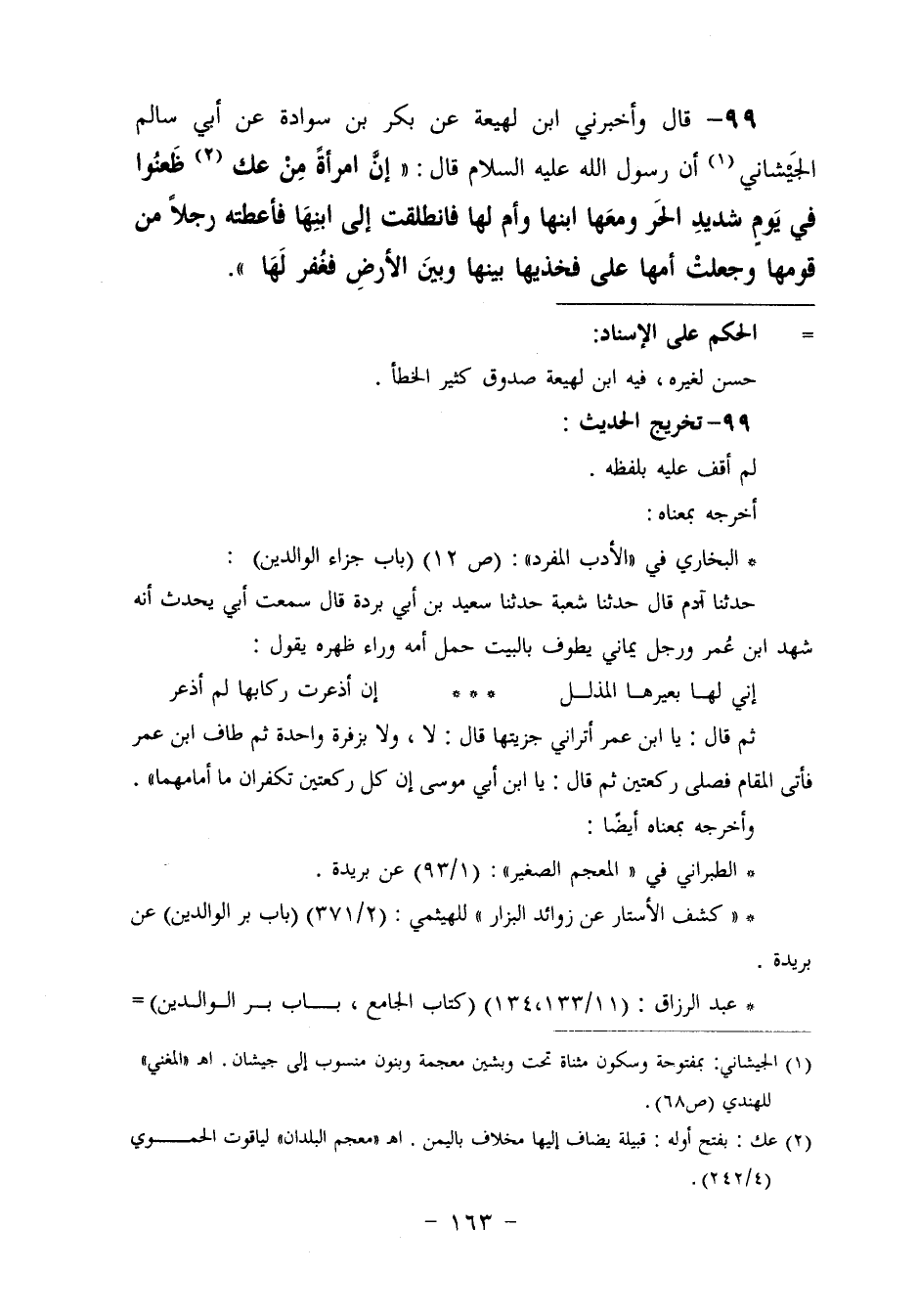 99 - وَأَخْبَرَنِي ابْنُ لَهِيعَةَ، عَنْ بَكْرِ بْنِ سَوَادَةَ، عَنْ أَبِي سَالِمٍ الْجَيْشَانِيِّ، أَنَّ رَسُولَ اللَّهِ عَلَيْهِ السَّلَامُ قَالَ: «إِنَّ §امْرَأَةً مِنْ عَكٍّ ظَعَنُوا فِي يَوْمٍ شَدِيدِ الْحَرِّ وَمَعَهَا ابْنُهَا، وَأُمٌّ لَهَا، فَانْطَلَقْتُ إِلَى ابْنِهَا فَأَعْطَتْهُ رَجُلًا مِنْ قَوْمِهَا، وَجَعَلَتْ أُمَّهَا عَلَى فَخِذَيْهَا بَيْنَهَا وَبَيْنَ الْأَرْضِ فَغُفِرَ لَهَا»