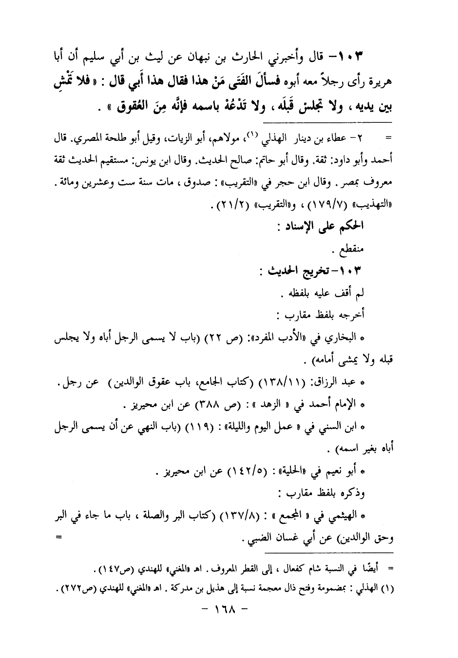 103 - وَأَخْبَرَنِي الْحَارِثُ بْنُ نَبْهَانَ، عَنْ لَيْثِ بْنِ أَبِي سُلَيْمٍ، أَنَّ أَبَا هُرَيْرَةَ، رَأَى رَجُلًا مَعَهُ أَبُوهُ فَسَأَلَ الْفَتَى: مَنْ هَذَا؟ فَقَالَ: هَذَا أَبِي، قَالَ: «§فَلَا تَمْشِ بَيْنَ يَدَيْهِ، وَلَا تَجْلِسْ قَبْلَهُ، وَلَا تَدْعُهُ بِاسْمِهِ، فَإِنَّهُ مِنَ الْعُقُوقِ»