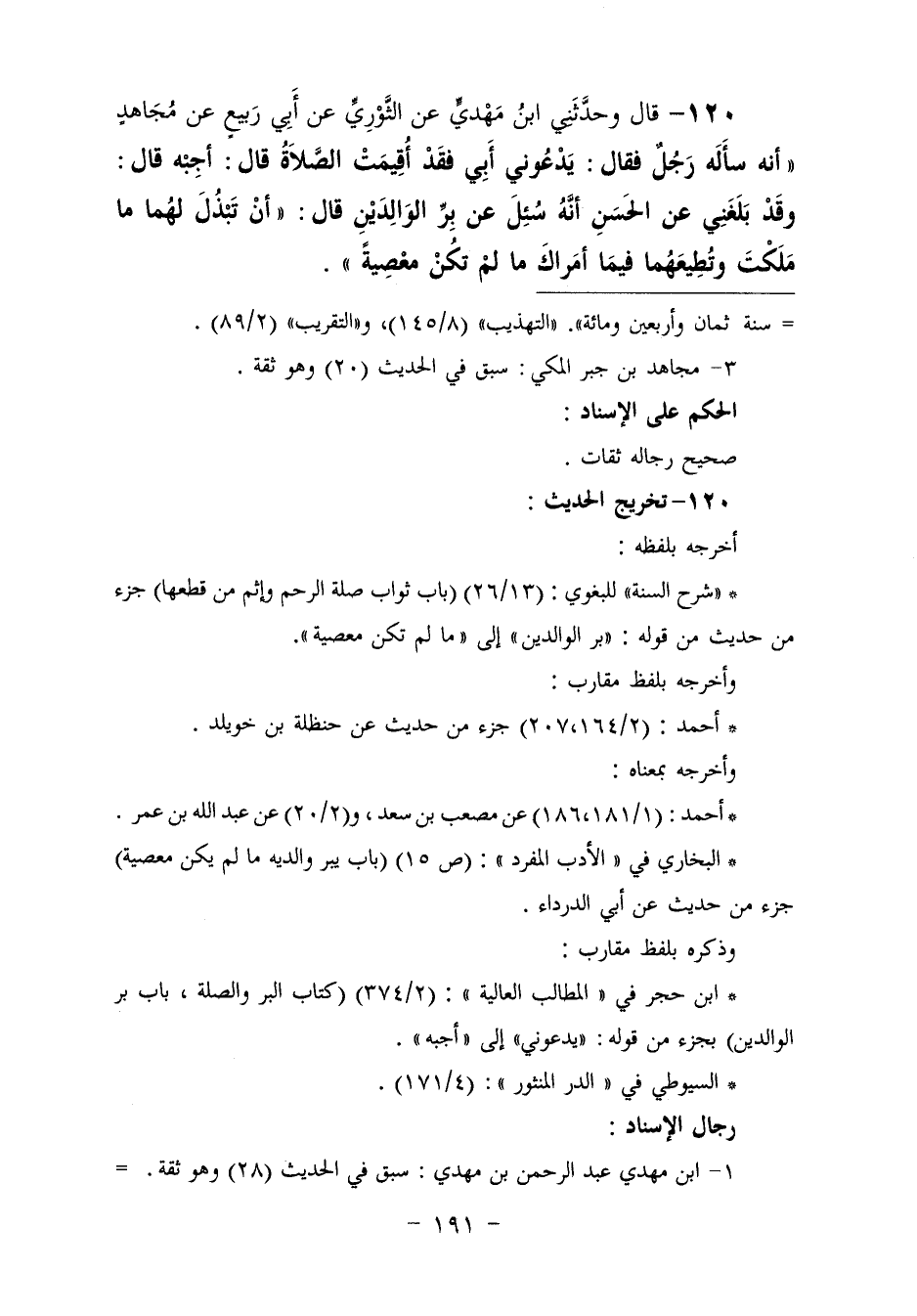 120 - وحَدَّثَنِي ابْنُ مَهْدِيٍّ، عَنِ الثَّوْرِيِّ، عَنْ أَبِي رَبِيعٍ، عَنْ مُجَاهِدٍ: " أَنَّهُ سَأَلَهُ رَجُلٌ فَقَالَ: " §يَدْعُونِي أَبِي وَقَدْ أُقِيمَتِ الصَّلَاةُ، قَالَ: أَجِبْهُ "
