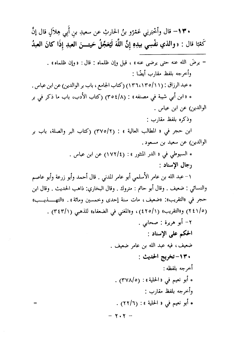 130 - وَأَخْبَرَنِي عَمْرُو بْنُ الْحَارِثِ، عَنْ سَعِيدِ بْنِ أَبِي هِلَالٍ، قَالَ: إِنَّ كَعْبًا قَالَ: " وَالَّذِي نَفْسِي بِيَدِهِ، إِنَّ §اللَّهَ لَيُعَجِّلُ حِينَ الْعَبْدِ إِذَا كَانَ الْعَبْدُ -[203]- عَاقًّا لِوَالِدَيْهِ لِيُعَجِّلَ لَهُ الْعَذَابَ، وَإِنَّ اللَّهَ لِيَزِيدُ فِي عُمُرِ الْعَبْدِ إِذَا كَانَ بَارًّا بِوَالِدَيْهِ لِيَزْدَادَ بِرًّا وَخَيْرًا. وَقَالَ كَعْبٌ: أَجِدُ فِي كِتَابِ اللَّهِ أَنَّهُ إِذَا دَعَاهُ فَلَمْ يُجِبْهُ فَقَدْ عَقَّهُ، وَإِذَا أَلْجَأَهُ إِلَى أَنْ يَدْعُوَ عَلَيْهِ وَيَبْكِيَ إِلَى اللَّهِ مِنْهُ فِيمَا بَيْنَهُ وَبَيْنَهُ فَقَدْ عَقَّهُ كُلَّ الْعُقُوقِ، وَإِذَا ائْتَمَنَهُ فَخَانَهُ فَقَدْ عَقَّهُ، وَإِذَا سَأَلَهُ مِمَّا يَقْدِرُ عَلَيْهِ فَمَنَعَهُ فَقَدْ عَقَّهُ "