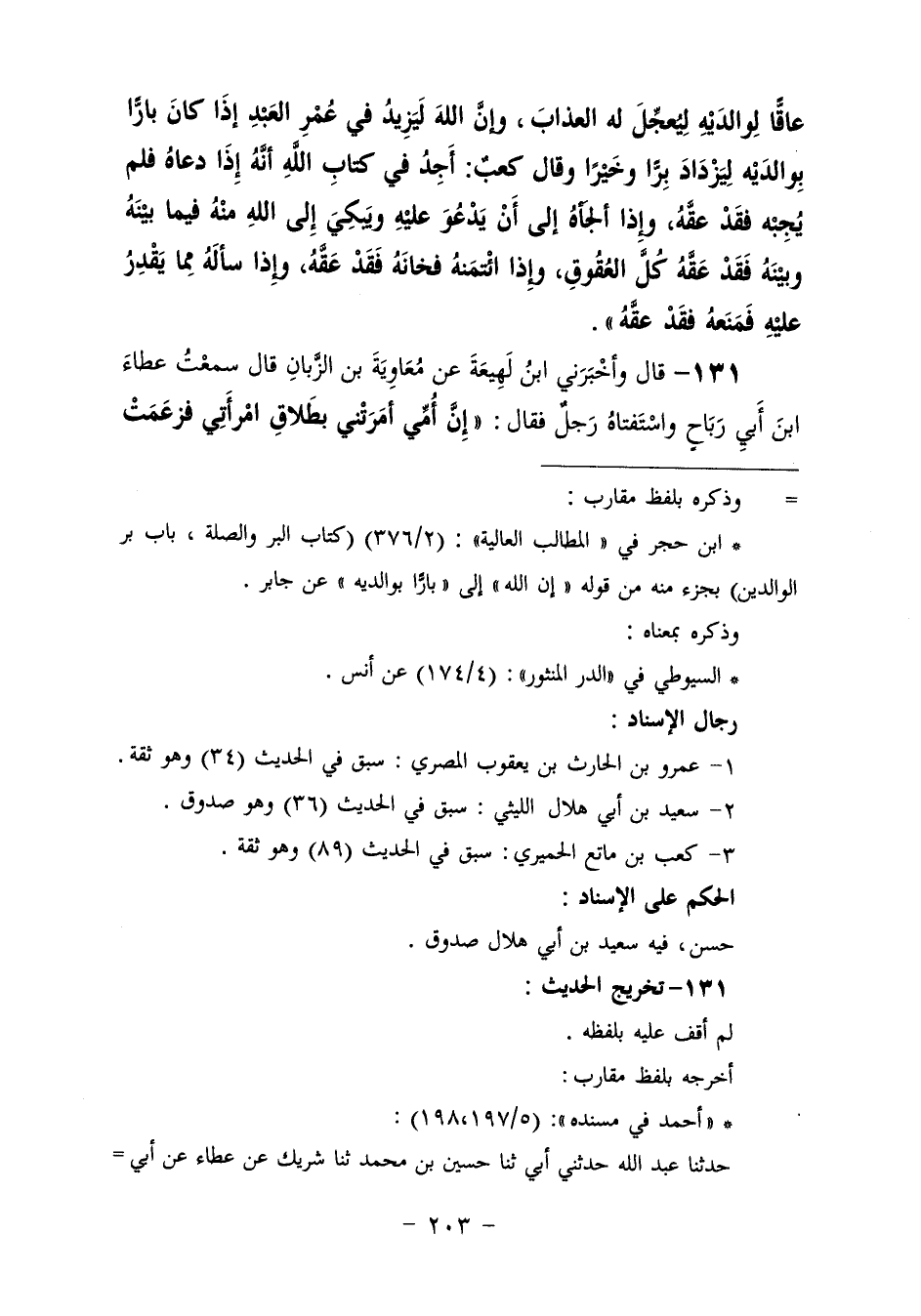 131 - وَأَخْبَرَنِي ابْنُ لَهِيعَةَ، عَنْ مُعَاوِيَةَ بْنِ الزَّبَّانِ، قَالَ: سَمِعْتُ عَطَاءَ بْنَ أَبِي رَبَاحٍ وَاسْتَفْتَاهُ رَجُلٌ، فَقَالَ: " إِنَّ أُمِّي أَمَرْتَنِي بِطَلَاقِ امْرَأَتِي، فَزَعَمَتْ -[204]- أَنَّهُ لَا يُرْضِيهَا إِلَّا ذَلِكَ، فَقَالَ: «§اتَّقِ اللَّهَ فِي أُمِّكَ، وَلَا تُفَارِقِ امْرَأَتَكَ»
