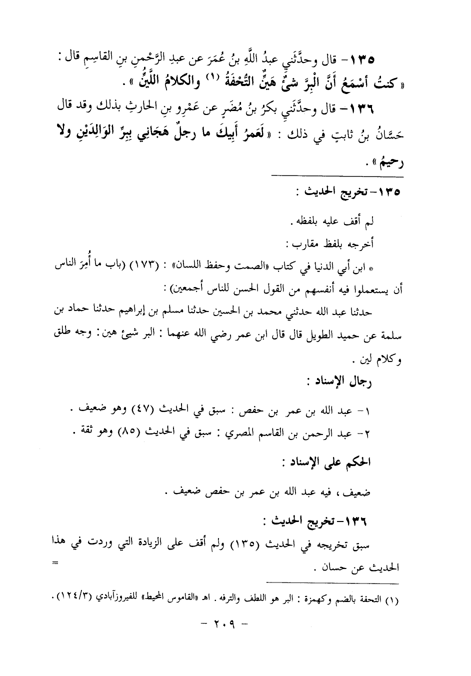135 - وَحَدَّثَنِي عَبْدُ اللَّهِ بْنُ عُمَرَ، عَنْ عَبْدِ الرَّحْمَنِ بْنِ الْقَاسِمِ، قَالَ: " §كُنْتُ أَسْمَعُ أَنَّ الْبِرَّ، شَيْءٌ هَيِّنٌ: التُّحْفَةُ وَالْكَلَامُ اللِّيِّنُ " قَالَ: وَحَدَّثَنِي بَكْرُ بْنُ مُضَرَ، عَنْ عَمْرِو بْنِ الْحَارِثِ، بِذَلِكَ،