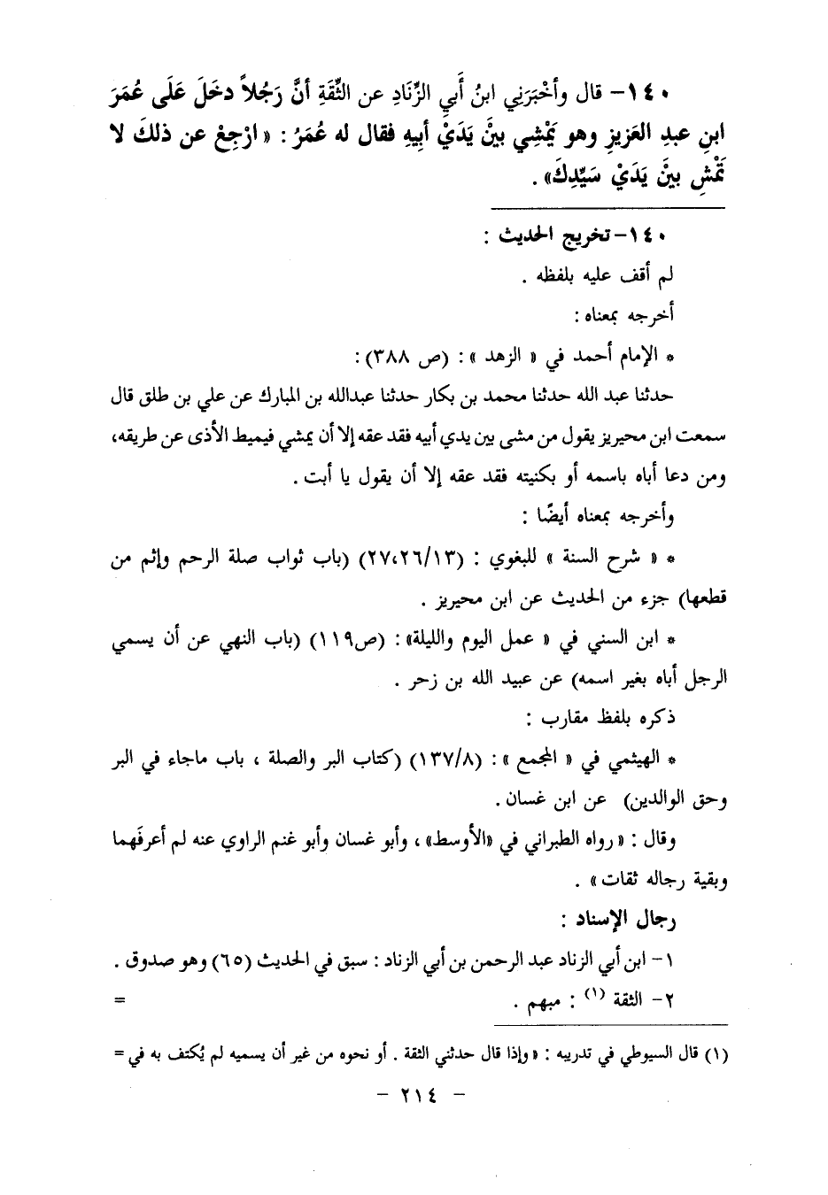 140 - وَأَخْبَرَنِي ابْنُ أَبِي الزِّنَادِ، عَنِ الثِّقَةِ، أَنَّ رَجُلًا، دَخَلَ عَلَى عُمَرَ بْنِ عَبْدِ الْعَزِيزِ وَهُوَ يَمْشِي بَيْنَ يَدَيْ أَبِيهِ، فَقَالَ لَهُ عُمَرُ: «§ارْجِعْ عَنْ ذَلِكَ، لَا تَمْشِ بَيْنَ يَدَيْ سَيِّدِكَ»