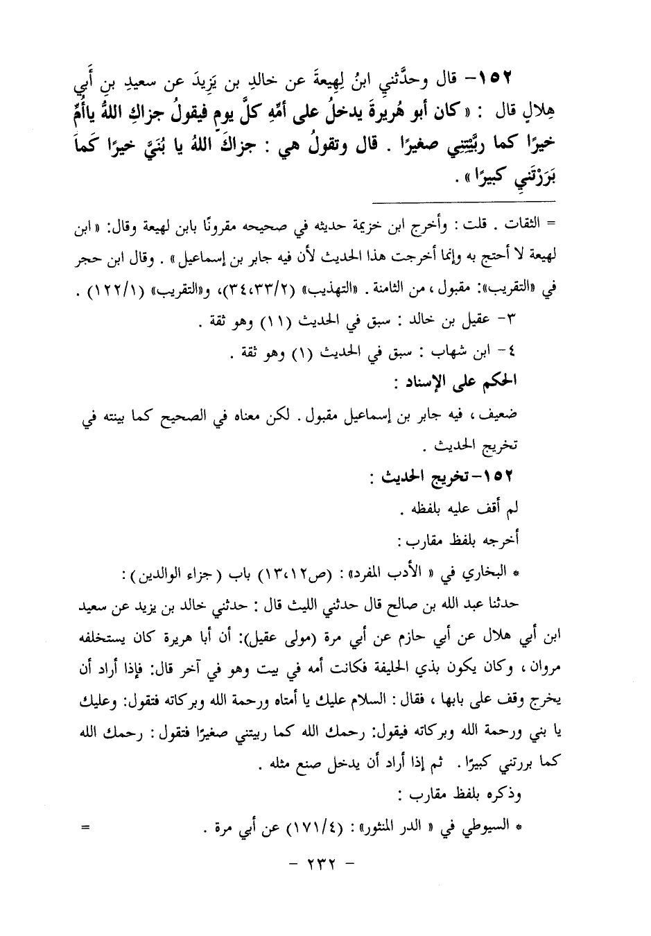 152 - وَحَدَّثَنِي ابْنُ لَهِيعَةَ، عَنْ خَالِدِ بْنِ يَزِيدَ، عَنْ سَعِيدِ بْنِ أَبِي هِلَالٍ، قَالَ: " كَانَ أَبُو هُرَيْرَةَ يَدْخُلُ عَلَى أُمِّهِ كُلَّ يَوْمٍ فَيَقُولُ: §جَزَاكِ اللَّهُ يَا أُمِّ خَيْرًا كَمَا رَبَّيْتِنِي صَغِيرًا. قَالَ: وَتَقُولُ هِيَ: جَزَاكَ اللَّهَ يَا بُنَيَّ خَيْرًا كَمَا بَرَرْتَنِي كَبِيرًا "