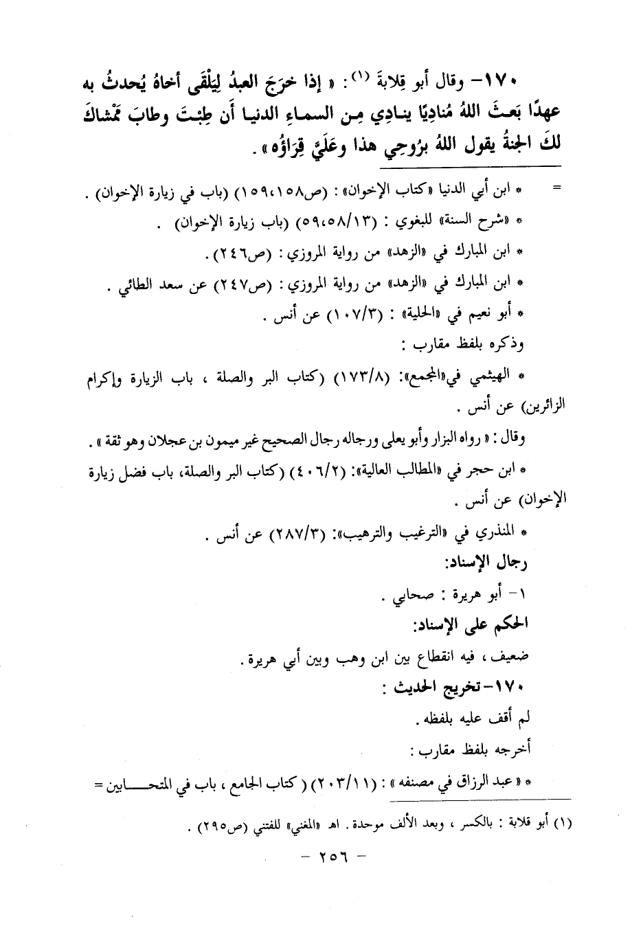 170 - وَقَالَ أَبُو قِلَابَةَ: " §إِذَا خَرَجَ الْعَبْدُ لِيَلْقَى أَخَاهُ يُحْدِثُ بِهِ عَهْدًا، بَعَثَ اللَّهُ مُنَادِيًا يُنَادِي مِنَ السَّمَاءِ الدُّنْيَا أَنْ طِبْتَ وَطَابَ مَمْشَاكَ، لَكَ الْجَنَّةُ. يَقُولُ اللَّهُ: بِرَوْحِي هَذَا، وَعَلَيَّ قِرَاؤُهُ "