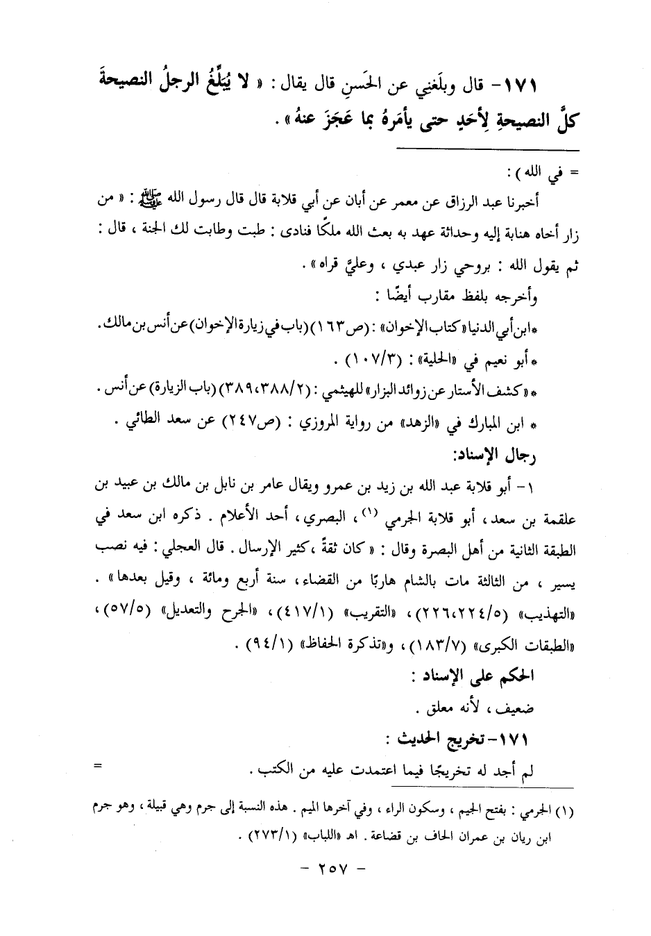 171 - وَبَلَغَنِي عَنِ الْحَسَنِ، قَالَ: يُقَالُ: «§لَا يُبَلِّغُ الرَّجُلُ النَّصِيحَةَ كُلَّ النَّصِيحَةِ لِأَحَدٍ حَتَّى يَأْمُرَهُ بِمَا عَجَزَ عَنْهُ»