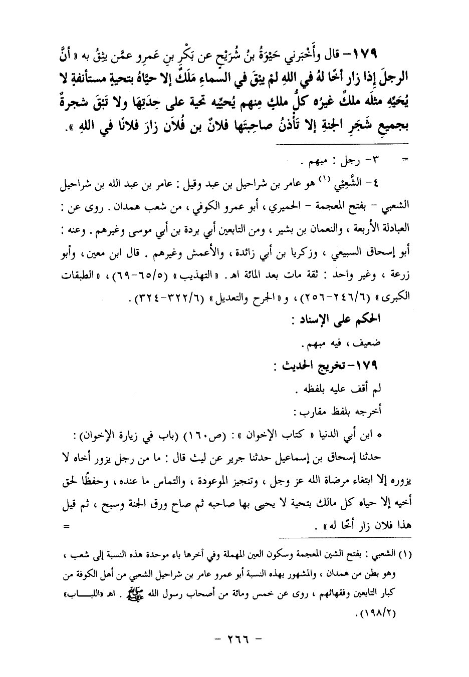 179 - وَأَخْبَرَنِي حَيْوَةُ بْنُ شُرَيْحٍ، عَنْ بَكْرِ بْنِ عَمْرٍو، عَمَّنْ يَثِقُ بِهِ: " أَنَّ §الرَّجُلَ، إِذَا زَارَ أَخًا لَهُ فِي اللَّهِ لَمْ يَبْقَ فِي السَّمَاءِ مَلَكٌ إِلَّا حَيَّاهُ بِتَحِيَّةٍ مُسْتَأْنَفَةٍ، لَا يُحَيِّهِ مِثْلَهُ مَلَكٌ غَيْرُهُ، كُلُّ مَلَكٍ مِنْهُمْ يُحَيِّيهِ تَحِيَّةً عَلَى حِدَتِهَا، وَلَا تَبْقَ شَجَرَةٌ بِجَمِيعِ شَجَرِ الْجَنَّةِ إِلَّا تُؤْذِنُ صَاحِبَتَهَا: فُلَانُ بْنُ فُلَانٍ زَارَ فُلَانًا فِي اللَّهِ "
