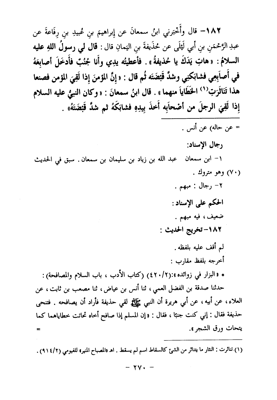 182 - وَأَخْبَرَنِي ابْنُ سَمْعَانَ، عَنْ إِبْرَاهِيمَ بْنِ عُبَيْدِ بْنِ رِفَاعَةَ، عَنْ عَبْدِ الرَّحْمَنِ بْنِ أَبِي لَيْلَى، عَنْ حُذَيْفَةَ بْنِ الْيَمَانِ، قَالَ: قَالَ لِي رَسُولُ اللَّهِ عَلَيْهِ السَّلَامُ: «هَاتِ يَدَكَ يَا حُذَيْفَةُ» . فَأَعْطَيْتُهُ يَدِي وَأَنَا جُنُبٌ، فَأَدْخَلَ أَصَابِعَهُ فِي أَصَابِعِي فَشَابَكَنِي، وَشَدَّ قَبْضَتَهُ، ثُمَّ قَالَ: «إِنَّ §الْمُؤْمِنَ إِذَا لَقِيَ الْمُؤْمِنَ فَصَنَعَا هَذَا تَنَاثَرَتِ الْخَطَايَا مِنْهُمَا» قَالَ ابْنُ سَمْعَانَ: وَكَانَ النَّبِيُّ عَلَيْهِ السَّلَامُ إِذَا لَقِيَ الرَّجُلُ مِنْ أَصْحَابِهِ أَخَذَ بِيَدِهِ فَشَابَكَهُ ثُمَّ شَدَّ قَبْضَتَهُ