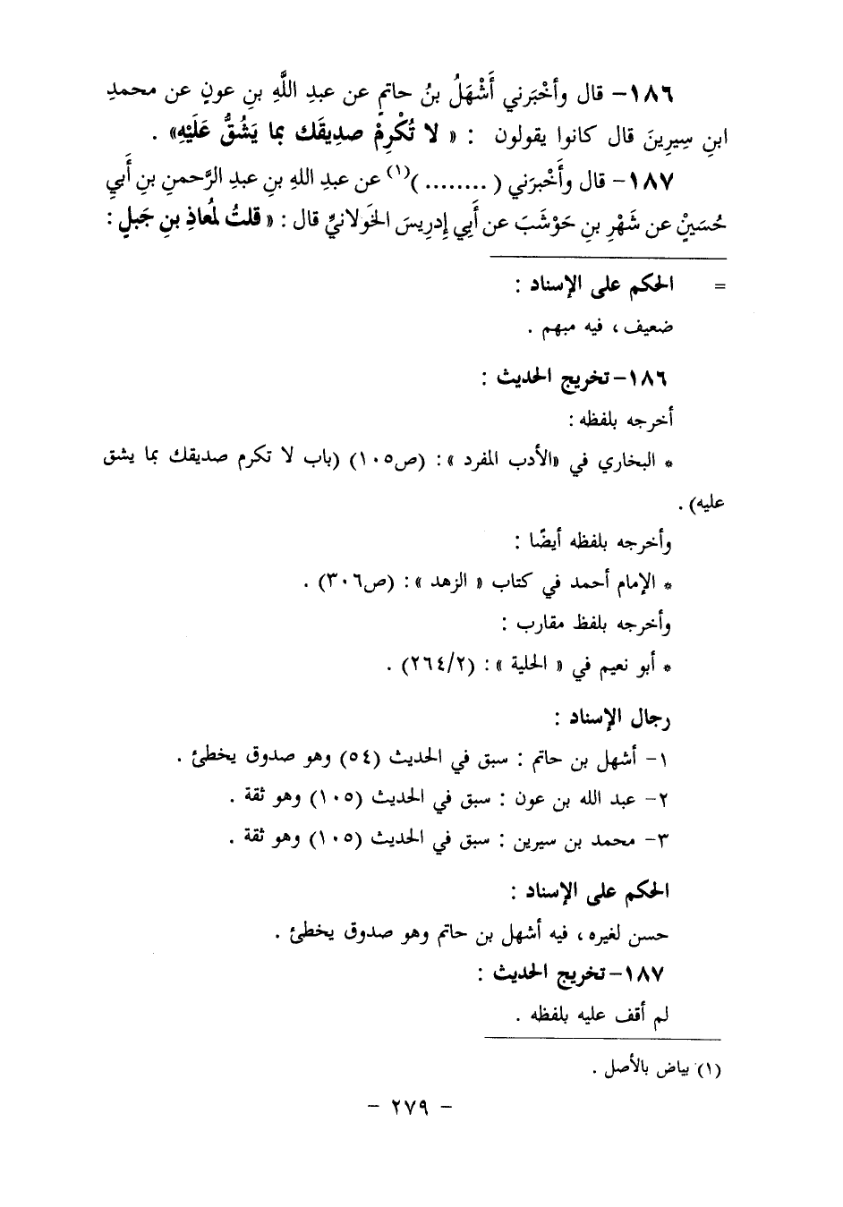 186 - وَأَخْبَرَنِي أَشْهَلُ بْنُ حَاتِمٍ، عَنْ عَبْدِ اللَّهِ بْنِ عَوْنٍ، عَنْ مُحَمَّدِ بْنِ سِيرِينَ، قَالَ: كَانُوا يَقُولُونَ: «§لَا تُكْرِمْ صَدِيقَكَ بِمَا يَشُقُّ عَلَيْهِ»