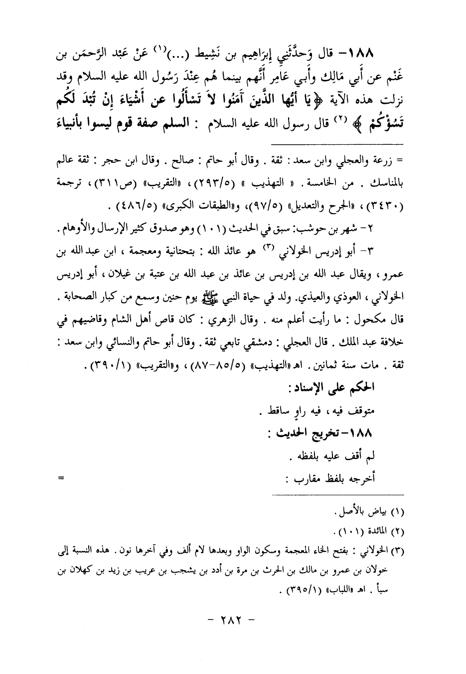 188 - وَحَدَّثَنِي إِبْرَاهِيمُ بْنُ نَشِيطٍ،. . .، عَنْ عَبْدِ الرَّحْمَنِ بْنِ غَنْمٍ، عَنْ أَبِي مَالِكٍ، وَأَبِي عَامِرٍ أَنَّهُمْ بَيْنَمَا هُمْ عِنْدَ رَسُولِ اللَّهِ عَلَيْهِ السَّلَامُ وَقَدْ نَزَلَتْ هَذِهِ الْآيَةُ: {يَا أَيُّهَا الَّذِينَ آمَنُوا لَا تَسْأَلُوا عَنْ أَشْيَاءَ إِنْ تُبْدَ لَكُمْ تَسُؤْكُمْ} [المائدة: 101] " قَالَ رَسُولُ اللَّهِ عَلَيْهِ السَّلَامُ: «§السِّلْمُ صِفَةُ قَوْمٍ لَيْسُوا بِأَنْبِيَاءَ -[283]- وَلَا شُهَدَاءَ يَغْبِطُهُمُ النَّبِيُّونَ وَالشُّهَدَاءُ بِقُرْبِهِمْ وَمَقْعَدِهِمْ مِنَ اللَّهِ يَوْمَ الْقِيَامَةِ» ، فَسَكَتُوا، فَلَمْ يَسْأَلُوا عَنْ شَيْءٍ وَجَثَا أَعْرَابِيٌّ عَلَى رُكْبَتِيهِ. . . يَا رَسُولَ اللَّهِ، حَتَّى نَعْرِفَهُمْ حَدِّثْنَا عَنْهُمْ، فَرَأَيْتُ الْأَعْرَابِيَّ قَالَ: هُمْ عِبَادُ اللَّهِ مِنْ بُلْدَانٍ شَتَّى، وَقَبَائِلَ شَتَّى، لَمْ يَكُنْ بَيْنَهُمْ أَرْحَامٌ يَتَوَاصَلُونَ بِهَا، وَلَا دُنْيَا يَتَبَاذَلُونَهَا، تَحَابَّوْا بِرُوحِ اللَّهِ، يُجْعَلُ الله لَهُمْ مَنَابِرُ مِنْ لُؤْلُؤٍ قُدَّامَ الرَّحْمَنِ تَعَالَى، يَفْزَعُ النَّاسُ وَلَا يَفْزَعُونَ، وَيَخَافُ النَّاسُ وَلَا يَخَافُونَ " -[284]-