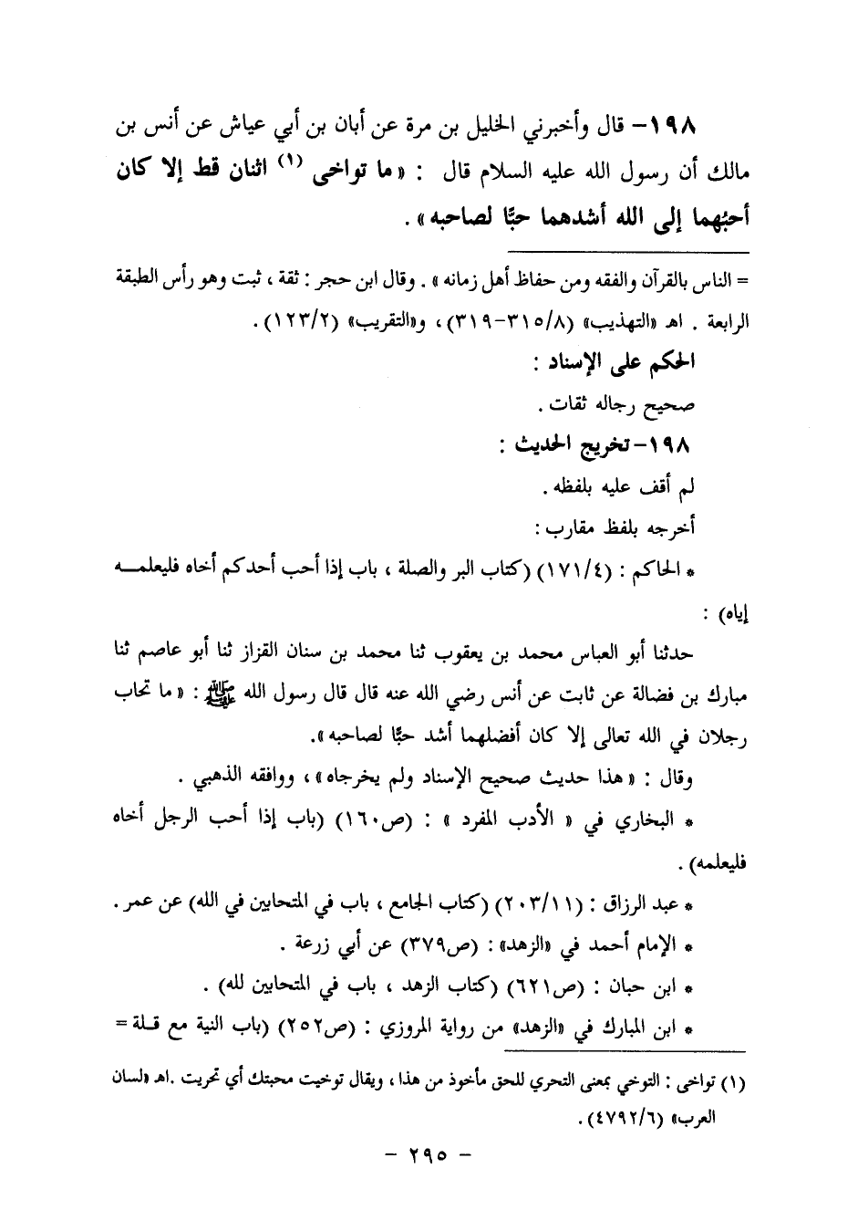 198 - وَأَخْبَرَنِي الْخَلِيلُ بْنُ مُرَّةَ، عَنْ أَبَانَ بْنِ أَبِي عَيَّاشٍ، عَنْ أَنَسِ بْنِ مَالِكٍ، أَنَّ رَسُولَ اللَّهِ عَلَيْهِ السَّلَامُ قَالَ: «§مَا تَواخَى اثْنَانِ قَطُّ إِلَّا كَانَ أَحَبُّهُمَا إِلَى اللَّهِ أَشَدَّهُمَا حُبًّا لِصَاحِبِهِ»