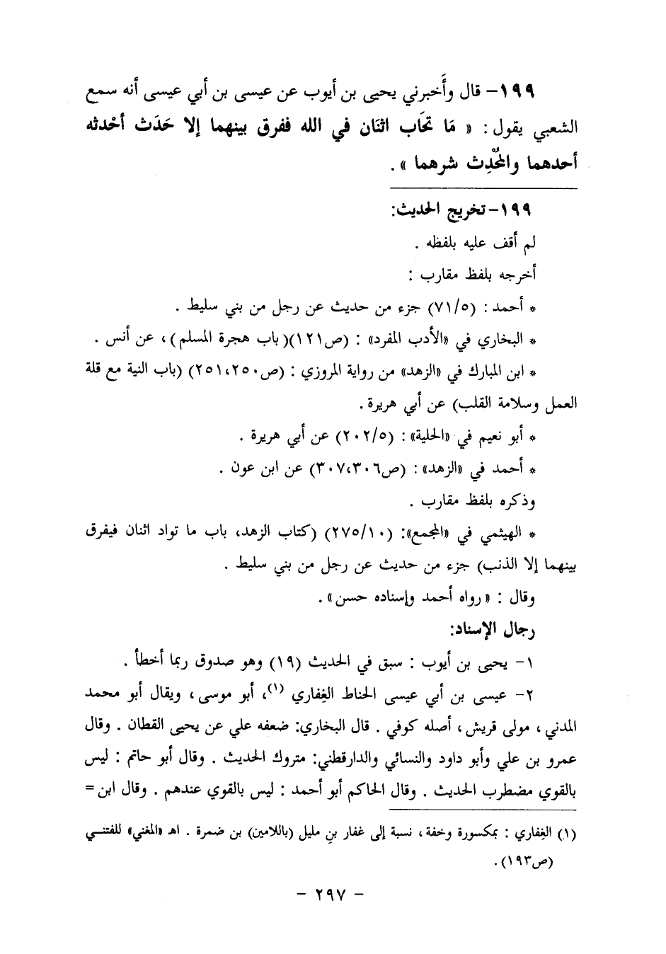 199 - وَأَخْبَرَنِي يَحْيَى بْنُ أَيُّوبَ، عَنْ عِيسَى بْنِ أَبِي عِيسَى، أَنَّهُ سَمِعَ الشَّعْبِيَّ، يَقُولُ: «§مَا تَحَابَّ اثْنَانِ فِي اللَّهِ فَفَرَّقَ بَيْنَهُمَا إِلَّا حَدَثٌ أَحْدَثَهُ أَحَدُهُمَا، وَالْمُحْدِثُ شَرُّهُمَا»