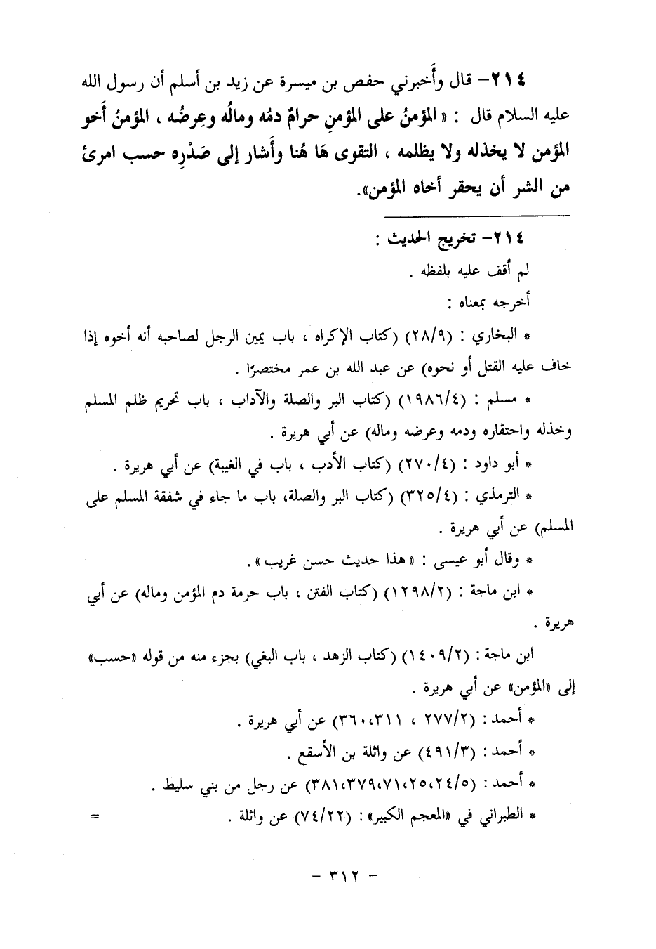 214 - وَأَخْبَرَنِي حَفْصُ بْنُ مَيْسَرَةَ، عَنْ زَيْدِ بْنِ أَسْلَمَ، أَنَّ رَسُولَ اللَّهِ عَلَيْهِ السَّلَامُ قَالَ: «§الْمُؤْمِنُ عَلَى الْمُؤْمِنِ حَرَامٌ، دَمُهُ، وَمَالُهُ، وَعِرْضُهُ، الْمُؤْمِنُ أَخُو الْمُؤْمِنِ، لَا يَخْذُلْهُ، وَلَا يَظْلِمْهُ، التَّقْوَى هَاهُنَا، وَأَشَارَ إِلَى صَدْرِهِ، حَسْبُ امْرِئٍ مِنَ الشَّرِّ أَنْ يَحْقِرَ أَخَاهُ الْمُؤْمِنَ»