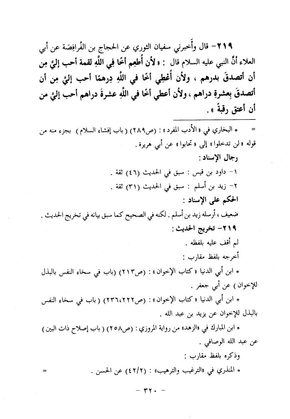 219 - وَأَخْبَرَنِي سُفْيَانُ الثَّوْرِيُّ، عَنِ الْحَجَّاجِ بْنِ الْفُرَافِصَةِ، عَنْ أَبِي الْعَلَاءِ، أَنَّ النَّبِيَّ عَلَيْهِ السَّلَامُ قَالَ: «§لَأَنْ أُطْعِمَ أَخًا فِي اللَّهِ لُقْمَةً أَحَبُّ إِلَيَّ مِنْ أَنْ أَتَصَدَّقَ بِدِرْهَمٍ، وَلَأَنْ أُعْطِيَ أَخًا فِي اللَّهِ دِرْهَمًا أَحَبُّ إِلَيَّ مِنْ أَنْ أَتَصَدَّقَ بِعَشَرَةِ دَرَاهِمَ، وَلَأَنْ أُعْطِيَ أَخًا فِي اللَّهِ عَشَرَةَ دَرَاهِمَ أَحَبُّ إِلَيَّ مِنْ أَنْ أُعْتِقَ رَقَبَةً»