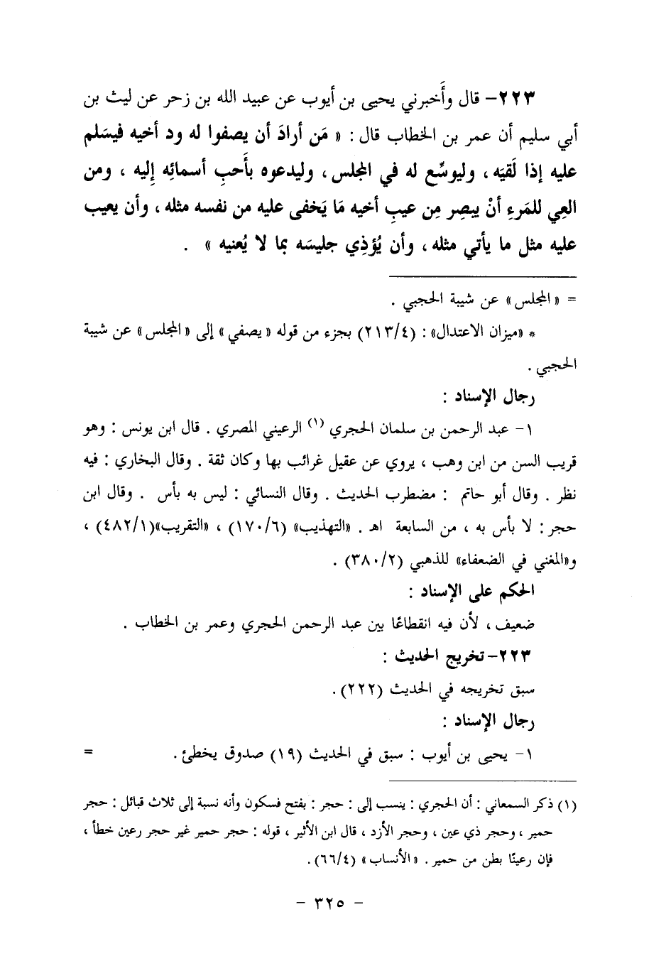 223 - وَأَخْبَرَنِي يَحْيَى بْنُ أَيُّوبَ، عَنْ عُبَيْدِ اللَّهِ بْنِ زَحْرٍ، عَنْ لَيْثِ بْنِ أبي سُلَيْمٍ، أَنَّ عُمَرَ بْنَ الْخَطَّابِ، قَالَ: «§مَنْ أَرَادَ أَنْ يَصْفُوَ، لَهُ وُدَّ أَخِيهِ فَلْيُسَلِّمْ عَلَيْهِ إِذَا لَقِيَهُ، ولِيُوَسِّعْ لَهُ فِي الْمَجْلِسِ، وَلَيْدُعُوهُ بِأَحَبِّ أَسْمَائِهِ إِلَيْهِ، وَمِنَ الْعِيِّ لِلْمَرْءِ أَنْ يُبْصِرَ مِنْ عَيْبِ أَخِيهِ مَا يَخْفَى عَلَيْهِ مِنْ نَفْسِهِ مِثْلُهُ، وَأَنْ يَعِيبَ عَلَيْهِ مِثْلَ مَا يَأْتِي مِثْلَهُ، وَأَنْ يُؤْذِيَ جَلِيسَهُ بِمَا لَا يُعْنِيهِ»
