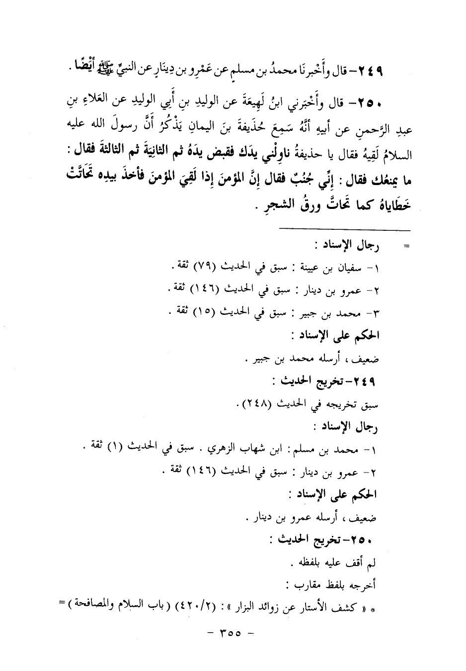 250 - وَأَخْبَرَنِي ابْنُ لَهِيعَةَ، عَنِ الْوَلِيدِ بْنِ أَبِي الْوَلِيدِ، عَنِ الْعَلَاءِ بْنِ عَبْدِ الرَّحْمَنِ، عَنْ أَبِيهِ، أَنَّهُ سَمِعَ حُذَيْفَةَ بْنَ الْيَمَانِ، يَذْكُرُ أَنَّ رَسُولَ اللَّهِ عَلَيْهِ السَّلَامُ لَقِيَهُ، فَقَالَ: " يَا حُذَيْفَةُ، نَاوِلْنِي يَدَكَ فَقَبَضَ يَدَهُ، ثُمَّ الثَّانِيَةَ، ثُمَّ الثَّالِثَةَ فَقَالَ: مَا يَمْنَعُكَ؟ "، فَقَالَ: إِنِّي جُنُبٌ، فَقَالَ: «إِنَّ §الْمُؤْمِنَ إِذَا لَقِيَ الْمُؤْمِنَ فَأَخَذَ بِيَدِهِ تَحَاتَّتْ خَطَايَاهُ كَمَا تَحَاتَّ وَرَقُ الشَّجَرِ»