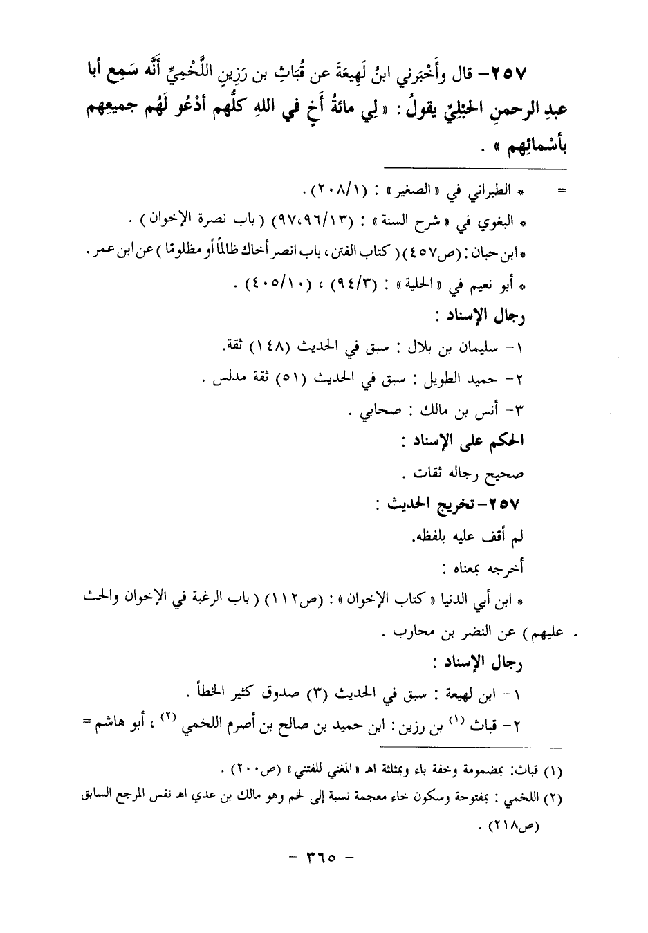 257 - وَأَخْبَرَنِي ابْنُ لَهِيعَةَ، عَنْ قَبَاثِ بْنِ رَزِينٍ اللَّخْمِيِّ، أَنَّهُ سَمِعَ أَبَا عَبْدِ الرَّحْمَنِ الْحُبُلِيَّ، يَقُولُ: «§لِي مِائَةُ أَخٍ فِي اللَّهِ، كُلُّهُمْ أَدْعُو لَهُمْ جَمِيعِهِمْ بِأَسْمَائِهِمْ»