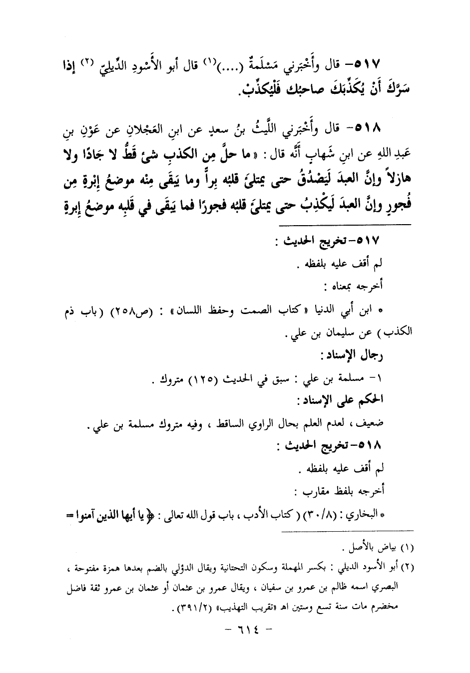 517 - وَأَخْبَرَنِي مَسْلَمَةُ،. . . قَالَ أَبُو الْأَسْوَدِ الدِّيلِيُّ: «§إِذَا سَرَّكَ أَنْ يَكْذِبَكَ صَاحِبُكَ فَلْيَكْذِبْ»