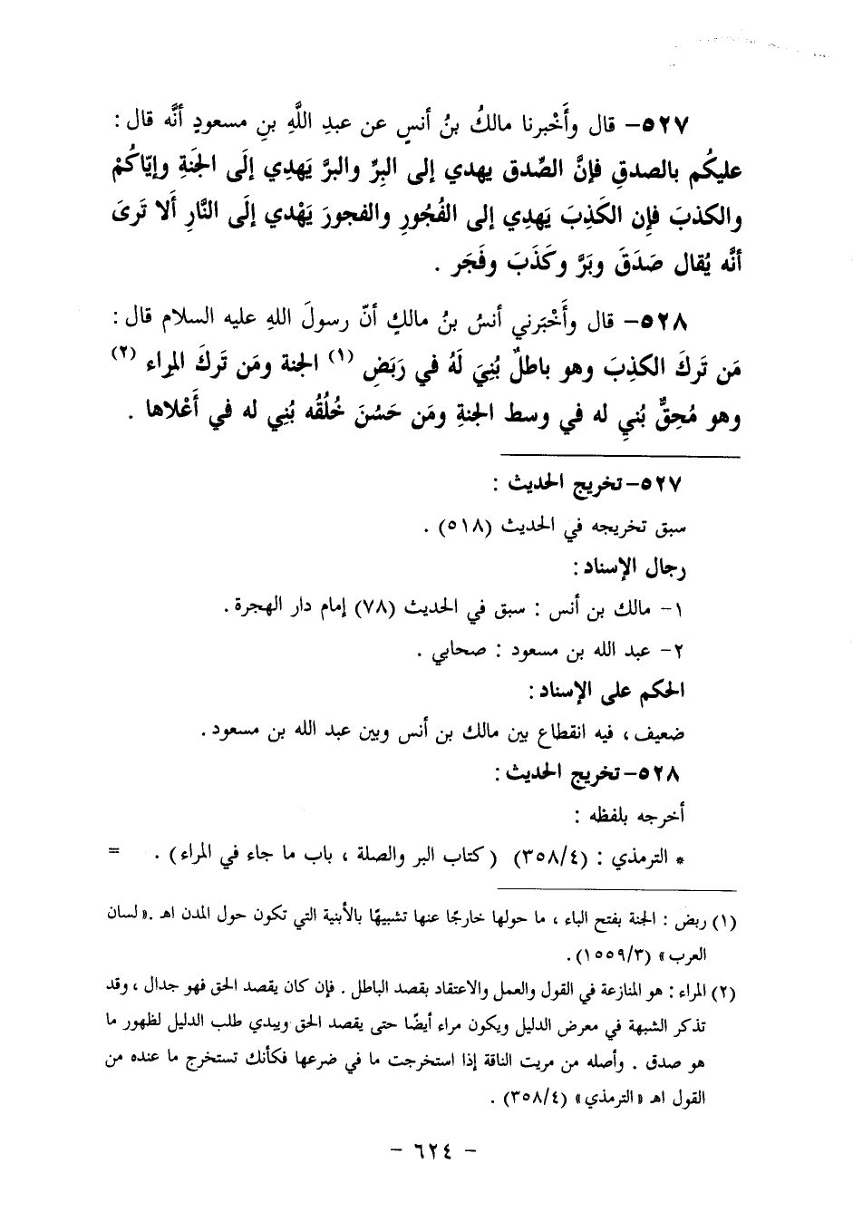 528 - وَأَخْبَرَنِي أَنَسُ بْنُ مَالِكٍ، أَنَّ رَسُولَ اللَّهِ عَلَيْهِ السَّلَامُ , قَالَ: «§مَنْ تَرَكَ الْكَذِبَ وَهُوَ بَاطِلٌ بُنِيَ لَهُ فِي رَبَضِ الْجَنَّةِ، وَمَنْ تَرَكَ الْمِرَاءَ وَهُوَ مُحِقٌّ بُنِيَ لَهُ فِي وَسَطِ الْجَنَّةِ، وَمَنْ حَسُنَ خُلُقُهُ بُنِيَ لَهُ فِي أَعْلَاهَا» -[625]-