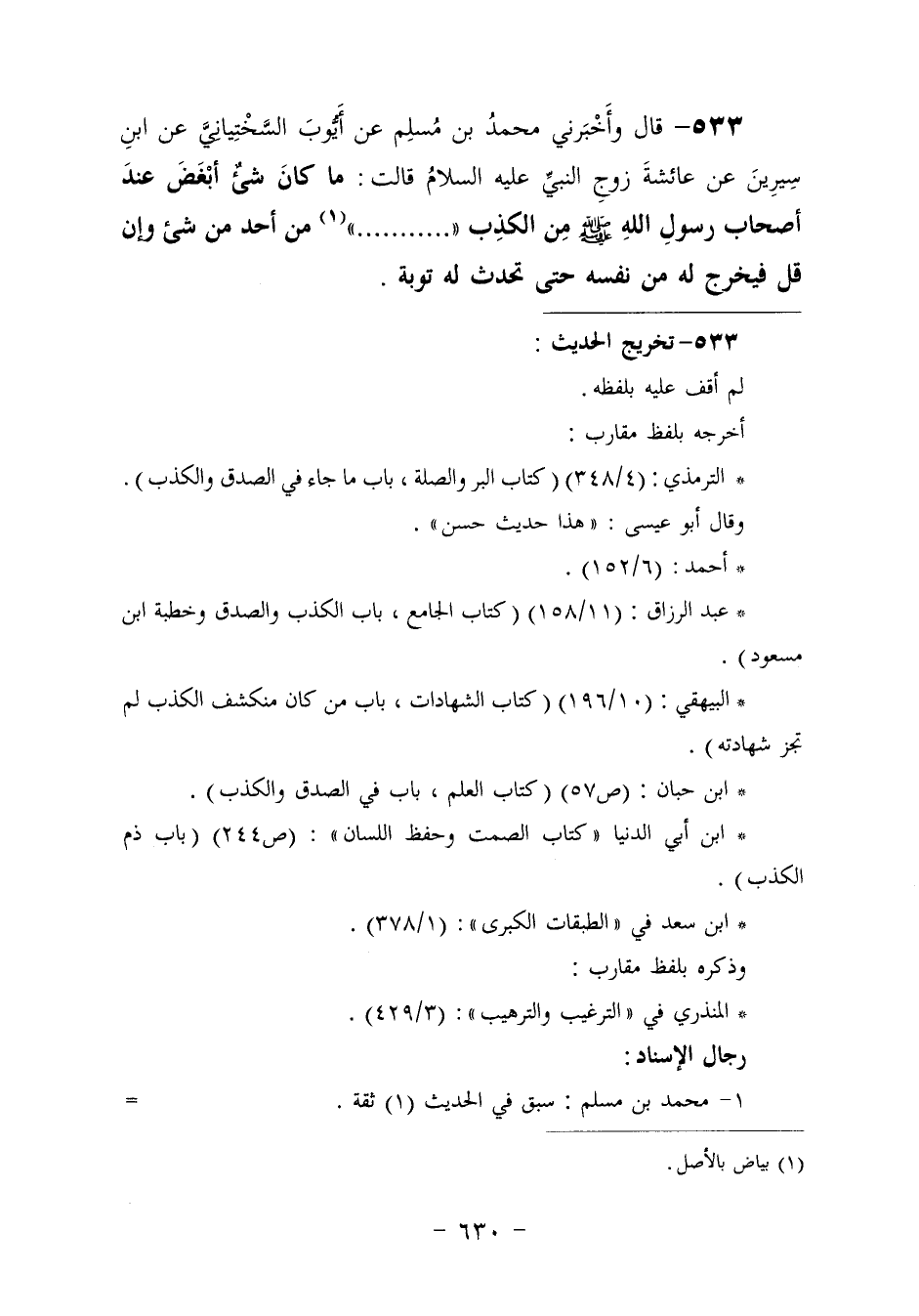 533 - وَأَخْبَرَنِي مُحَمَّدُ بْنُ مُسْلِمٍ، عَنْ أَيُّوبَ السَّخْتِيَانِيِّ، عَنِ ابْنِ سِيرِينَ، عَنْ عَائِشَةَ، زَوْجِ النَّبِيِّ عَلَيْهِ السَّلَامُ , قَالَتْ: «§مَا كَانَ شَيْءٌ أَبْغَضَ عِنْدَ أَصْحَابِ رَسُولِ اللَّهِ , صَلَّى اللهُ عَلَيْهِ وَسَلَّمَ , مِنَ الْكَذِبِ (. . . . . . . . .) مِنْ أَحَدٍ مِنْ شَيْءٍ، وَإِنْ قَلَّ فَيُخْرِجُ لَهُ مِنْ نَفْسِهِ حَتَّى تُحْدِثَ لَهُ تَوْبَةً»