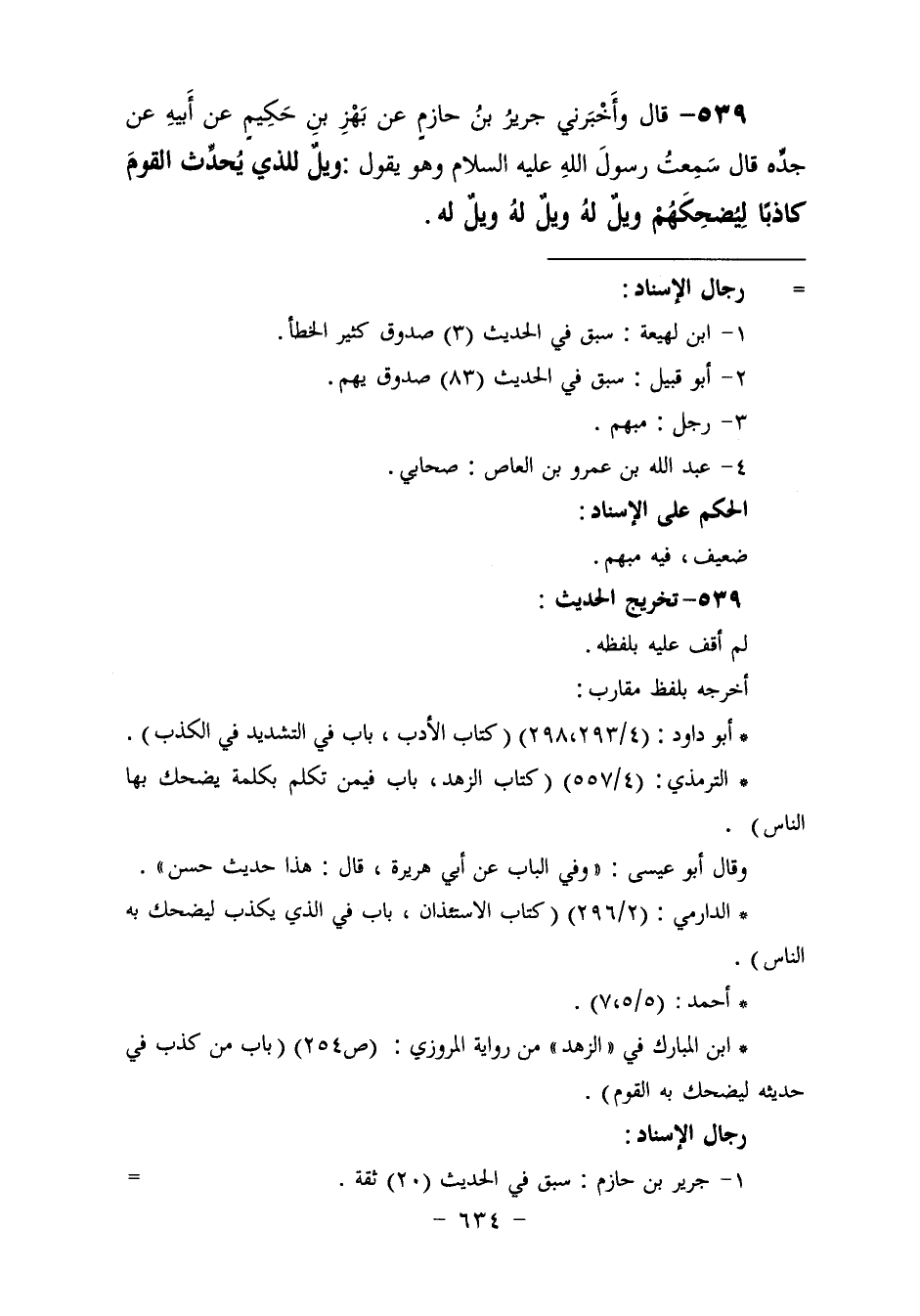 539 - وَأَخْبَرَنِي جَرِيرُ بْنُ حَازِمٍ، عَنْ بَهْزِ بْنِ حَكِيمٍ، عَنْ أَبِيهِ، عَنْ جَدِّهِ، قَالَ: سَمِعْتُ رَسُولَ اللَّهِ عَلَيْهِ السَّلَامُ , وَهُوَ يَقُولُ: «§وَيْلٌ لِلَّذِي يُحَدِّثُ الْقَوْمَ كَاذِبًا لِيُضْحِكَهُمْ، وَيْلٌ لَهُ، وَيْلٌ لَهُ» وَيْلٌ لَهُ "
