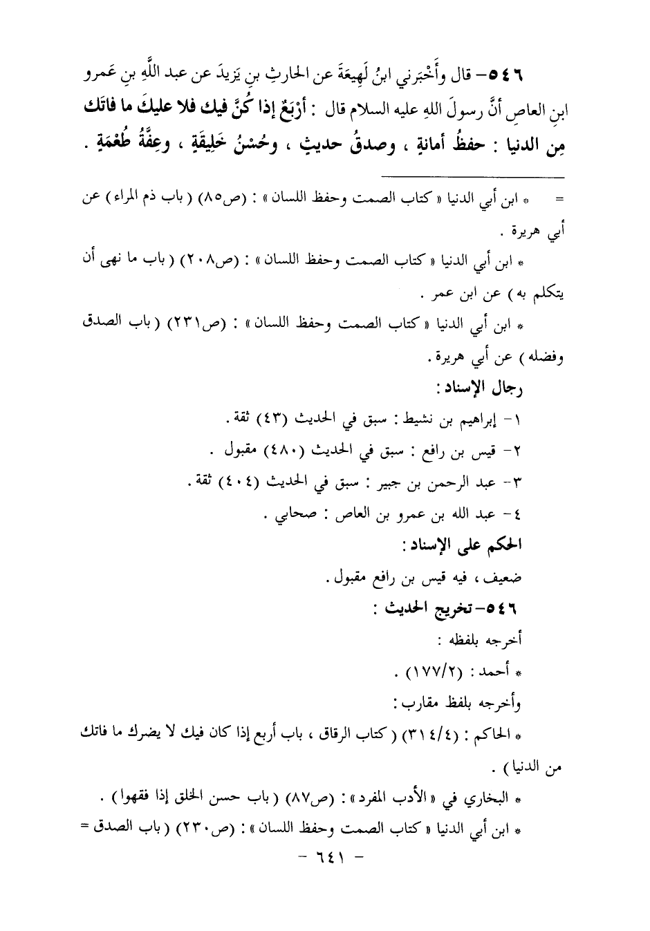546 - وَأَخْبَرَنِي ابْنُ لَهِيعَةَ، عَنِ الْحَارِثِ بْنِ يَزِيدَ، عَنْ عَبْدِ اللَّهِ بْنِ عَمْرِو بْنِ الْعَاصِ، أَنَّ رَسُولَ اللَّهِ عَلَيْهِ السَّلَامُ , قَالَ: " §أَرْبَعٌ إِذَا كُنَّ فِيكَ فَلَا عَلَيْكَ مَا فَاتَكَ مِنَ الدُّنْيَا: حَفِظُ أَمَانَةٍ، وَصِدْقُ حَدِيثٍ، وَحُسْنُ خَلِيقَةٍ، وَعِفَّةُ طُعْمَةٍ "