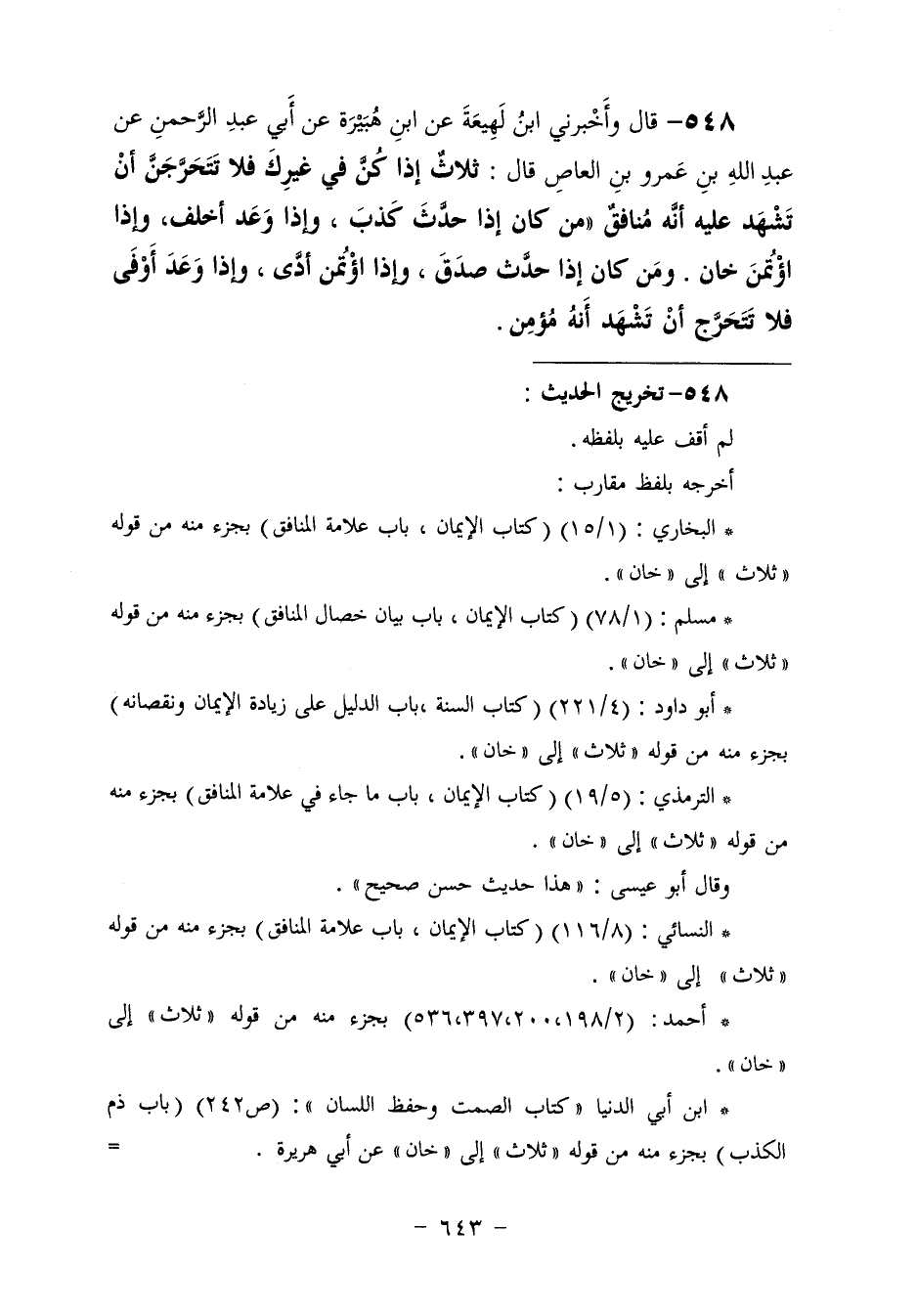 548 - وَأَخْبَرَنِي ابْنُ لَهِيعَةَ، عَنِ ابْنِ هُبَيْرَةَ، عَنْ أَبِي عَبْدِ الرَّحْمَنِ، عَنْ عَبْدِ اللَّهِ بْنِ عَمْرِو بْنِ الْعَاصِ، قَالَ: " §ثَلَاثٌ إِذَا كُنَّ فِي غَيْرِكَ فَلَا تَتَحَرَّجَنَّ أَنْ تَشْهَدَ عَلَيْهِ أَنَّهُ مُنَافِقٌ: مَنْ كَانَ إِذَا حَدَّثَ كَذَبَ، وَإِذَا وَعَدَ أَخْلَفَ، وَإِذَا اؤْتُمِنَ خَانَ. وَمَنْ كَانَ إِذَا حَدَّثَ صَدَقَ، وَإِذَا اؤْتُمِنَ أَدَّى، وَإِذَا وَعَدَ أَوْفَى فَلَا تَتَحَرَّجْ أَنْ تَشْهَدَ أَنَّهُ مُؤْمِنٌ "