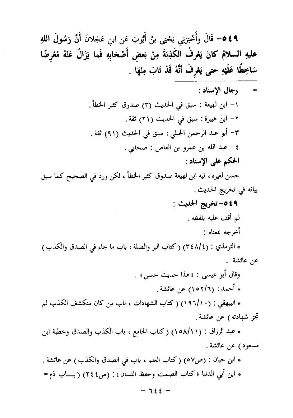 549 - وَأَخْبَرَنِي يَحْيَى بْنُ أَيُّوبَ، عَنِ ابْنِ عَجْلَانَ، أَنَّ رَسُولَ اللَّهِ عَلَيْهِ السَّلَامُ «كَانَ §يَعْرِفُ الْكِذْبَةَ مِنْ بَعْضِ أَصْحَابِهِ، فَمَا يَزَالُ عَنْهُ مُعْرِضًا سَاخِطًا عَلَيْهِ حَتَّى يَعْرِفَ أَنَّهُ قَدْ تَابَ مِنْهَا»