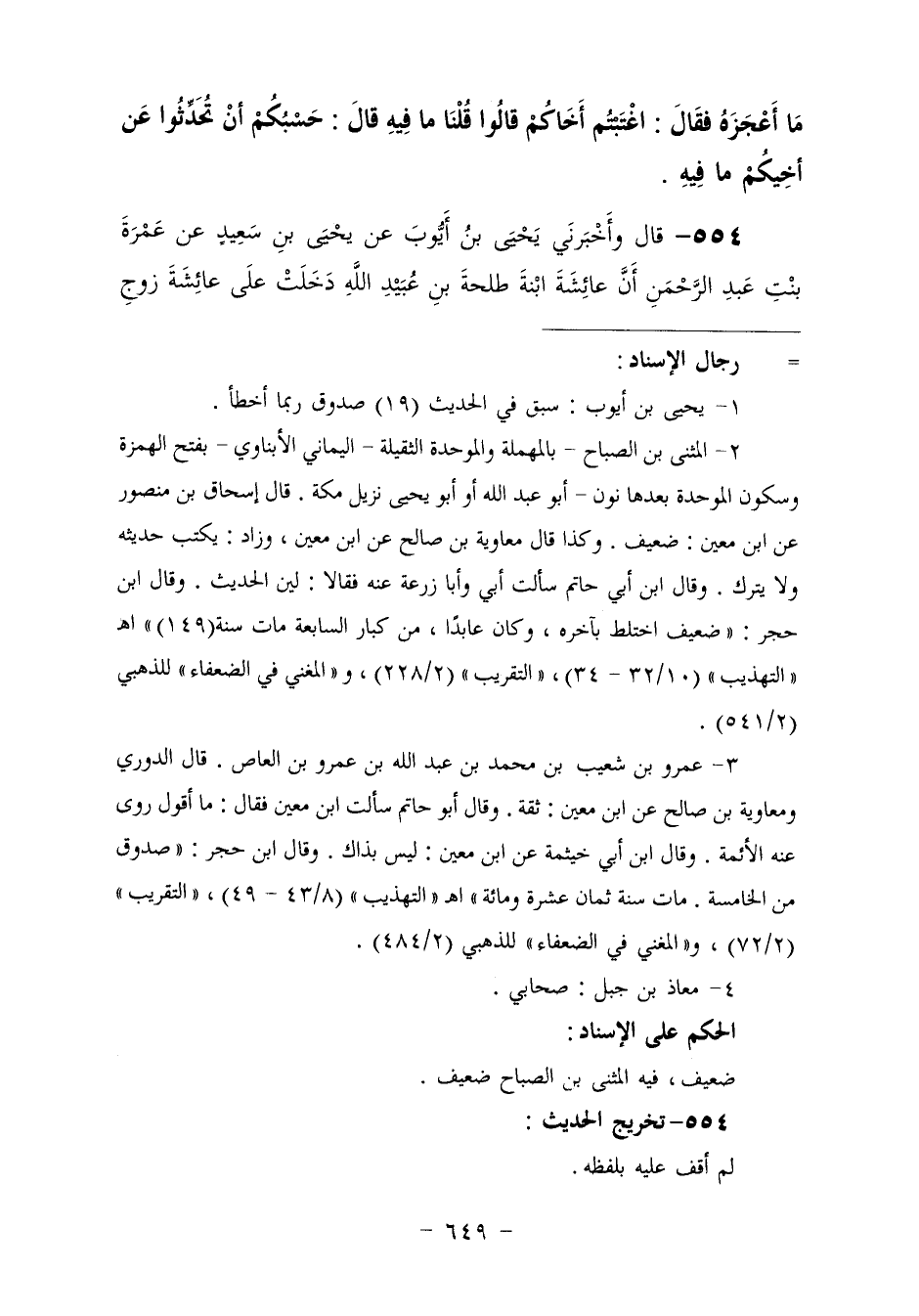 554 - وَأَخْبَرَنِي يَحْيَى بْنُ أَيُّوبَ، عَنْ يَحْيَى بْنِ سَعِيدٍ، عَنْ عَمْرَةَ بِنْتِ عَبْدِ الرَّحْمَنِ، أَنَّ عَائِشَةَ ابْنَةَ طَلْحَةَ بْنِ عُبَيْدِ اللَّهِ، دَخَلَتْ عَلَى عَائِشَةَ زَوْجِ -[650]- النَّبِيِّ عَلَيْهِ السَّلَامُ , وَعِنْدَهَا أَعْرَابِيَّةٌ، فَخَرَجَتِ الْأَعْرَابِيَّةُ عَلَى ذَيْلِهَا، فَقَالَتْ عَائِشَةُ بِنْتُ طَلْحَةَ: مَا أَطْوَلَ ذَيْلَهَا , فَقَالَتْ لَهَا عَائِشَةُ، زَوْجُ النَّبِيِّ , عَلَيْهِ السَّلَامُ: «§اغْتَبْتِيهَا، أَدْرِكِيهَا تَسْتَغْفِرْ لَكِ»