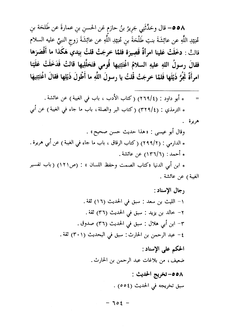 558 - وَحَدَّثَنِي جَرِيرُ بْنُ حَازِمٍ، عَنِ الْحَسَنِ بْنِ عُمَارَةَ، عَنْ طَلْحَةَ بْنِ عُبَيْدِ اللَّهِ، عَنْ عَائِشَةَ بِنْتِ طَلْحَةَ بْنِ عُبَيْدِ اللَّهِ، عَنْ عَائِشَةَ، زَوْجِ النَّبِيِّ عَلَيْهِ السَّلَامُ قَالَتْ: دَخَلَتْ عَلَيْنَا امْرَأَةٌ قَصِيرَةٌ، فَلَمَّا خَرَجَتْ قُلْتُ بِيَدِي هَكَذَا: مَا أَقْصَرَهَا، فَقَالَ رَسُولُ اللَّهِ عَلَيْهِ السَّلَامُ: «§اغْتَبْتِيهَا، قَوْمِي فَتَحَلَّلِيهَا» ، قَالَتْ: فَدَخَلَتْ عَلَيْنَا امْرَأَةٌ تَجُرُّ ذَيْلَهَا، فَلَمَّا خَرَجَتْ قُلْتُ: يَا رَسُولَ اللَّهِ، مَا أَطْوَلَ ذَيْلَهَا، فَقَالَ: «اغْتَبْتِيهَا -[655]-، فَقُومِي فَتَحَلَّلِيهَا»