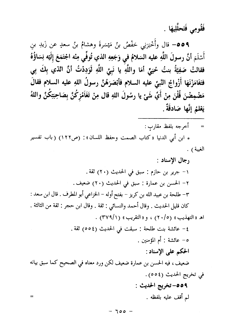 559 - وَأَخْبَرَنِي حَفْصُ بْنُ مَيْسَرَةَ، وَهِشَامُ بْنُ سَعْدٍ، عَنْ زَيْدِ بْنِ أَسْلَمَ، أَنَّ رَسُولَ اللَّهِ عَلَيْهِ السَّلَامُ فِي وَجَعِهِ الَّذِي تُوُفِّيَ مِنْهُ اجْتَمَعَ إِلَيْهِ نِسَاؤُهُ، فَقَالَتْ صَفِيَّةُ بِنْتُ حُيَيٍّ: أَمَا وَاللَّهِ يَا نَبِيَّ اللَّهِ لَوَدِدْتُ أَنَّ الَّذِي بِكَ بِي، فَتَغَامَزْنَهَا أَزْوَاجُ النَّبِيِّ عَلَيْهِ السَّلَامُ , فَأَبْصَرَهُنَّ رَسُولُ اللَّهِ عَلَيْهِ السَّلَامُ فَقَالَ: «§مَضْمِضْنَ» ، قُلْنَ: مِنْ أَيِّ شَيْءٍ يَا رَسُولَ اللَّهِ؟ قَالَ: «مِنْ تَغَامُزِكُنَّ بِصَاحِبَتِكُنَّ، وَاللَّهُ يَعْلَمُ إِنَّهَا صَادِقَةٌ»