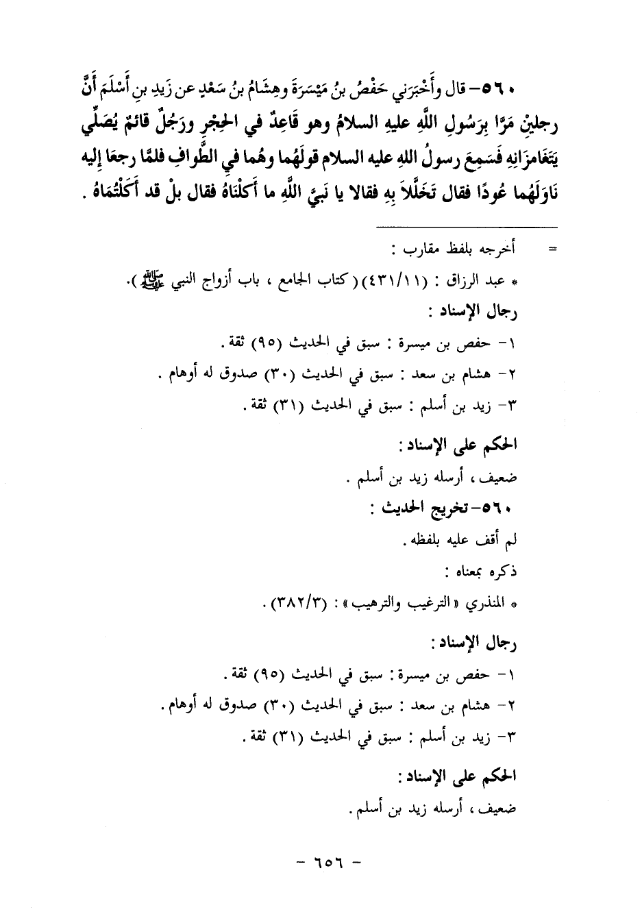 560 - وَأَخْبَرَنِي حَفْصُ بْنُ مَيْسَرَةَ، وَهِشَامُ بْنُ سَعْدٍ، عَنْ زَيْدِ بْنِ أَسْلَمَ، " أَنَّ رَجُلَيْنِ، مَرَّا بِرَسُولِ اللَّهِ عَلَيْهِ السَّلَامُ وَهُوَ قَاعِدٌ فِي الْحِجْرِ، وَرَجُلٌ قَائِمٌ يُصَلِّي يَتَغَامَزَانِهِ، فَسَمِعَ رَسُولُ اللَّهِ عَلَيْهِ السَّلَامُ قَوْلَهُمَا وَهُمَا فِي الطَّوَافِ، فَلَمَّا رَجَعَا إِلَيْهِ نَاوَلَهُمَا عُودًا فَقَالَ: «§تَخَلَّلَا بِهِ» ، فَقَالَا: يَا نَبِيَّ اللَّهِ، مَا أَكَلْنَاهُ، فَقَالَ: «بَلْ قَدْ أَكَلْتُمَاهُ»