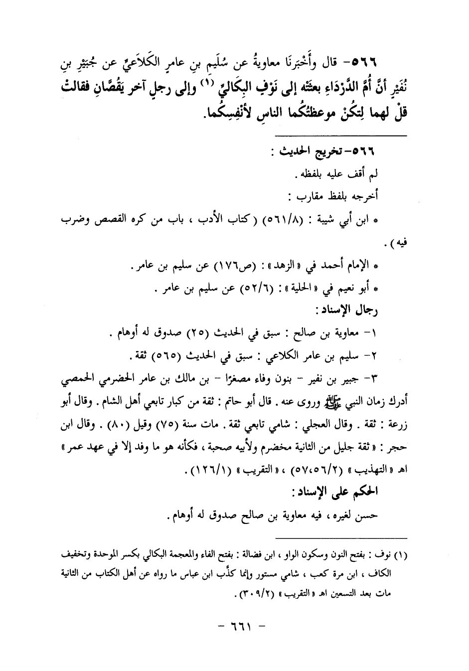 566 - وَأَخْبَرَنَا مُعَاوِيَةُ، عَنْ سُلَيْمِ بْنِ عَامِرٍ الْكَلَاعِيِّ، عَنْ جُبَيْرِ بْنِ نُفَيْرٍ، أَنَّ أُمَّ الدَّرْدَاءِ، بَعَثَتْهُ إِلَى نَوْفٍ الْبِكَالِيِّ، وَإِلَى رَجُلٍ آخَرَ يَقُصَّانِ، فَقَالَتْ: " قُلْ لَهُمَا: «§لِتَكُنْ مَوْعِظَتُكُمَا النَّاسَ لِأَنْفُسِكُمَا»