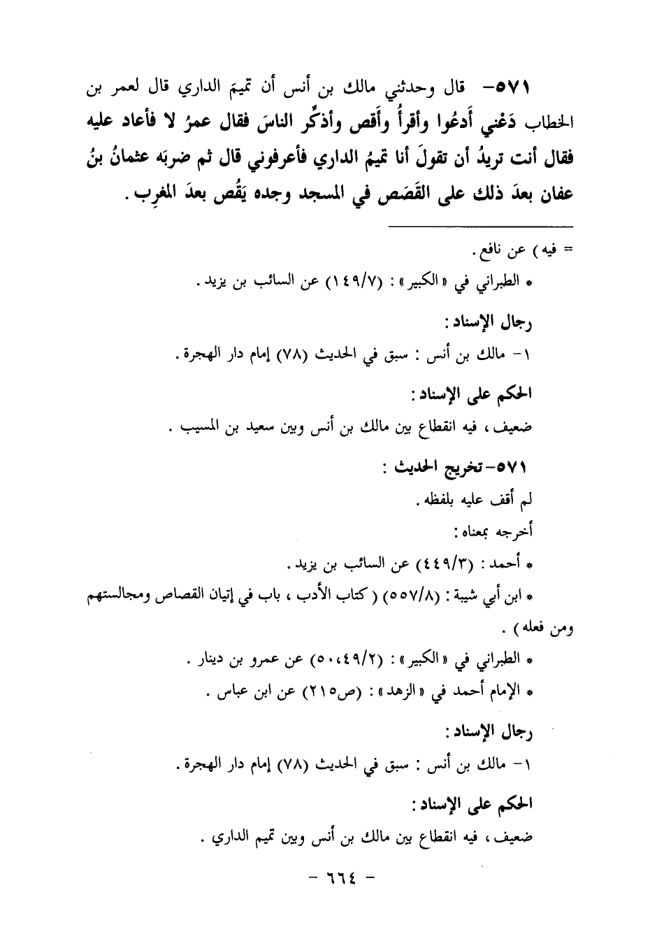 571 - وَحَدَّثَنِي مَالِكُ بْنُ أَنَسٍ، §أَنَّ تَمِيمًا الدَّارِيَّ، قَالَ لِعُمَرَ بْنِ الْخَطَّابِ: دَعْنِي أَدْعُوا وَأَقْرَأُ وَأَقُصُّ وَأُذَكِّرُ النَّاسَ، فَقَالَ عُمَرُ: لَا. فَأَعَادَ عَلَيْهِ، فَقَالَ: أَنْتَ تُرِيدُ أَنْ تَقُولَ: أَنَا تَمِيمٌ الدَّارِيُّ فَاعْرِفُونِي، قَالَ: ثُمَّ ضَرَبَهُ عُثْمَانُ بْنُ عَفَّانَ بَعْدَ ذَلِكَ عَلَى الْقَصَصِ فِي الْمَسْجِدِ، وَجَدَهُ يَقُصُّ بَعْدَ الْمَغْرِبِ